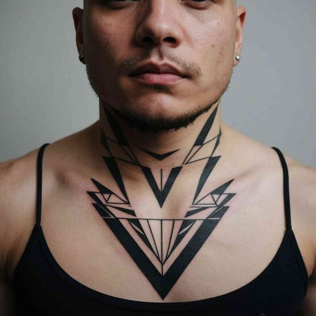 Geometric shapes, such as triangles and lines, symbolize balance and symmetry. For a modern and subtle look, minimalist geometric tattoos on the chest and neck are perfect for both men and women.