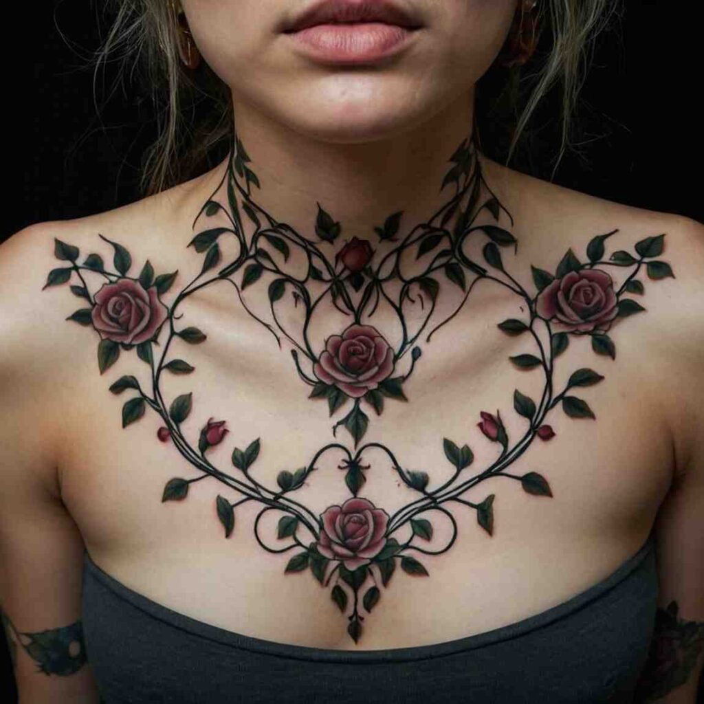 Roses signify love and passion, while vines represent growth. Together, these elements create a stunning and meaningful tattoo. A chest-neck design with roses blooming upward can be a symbol of new beginnings or deep affection.