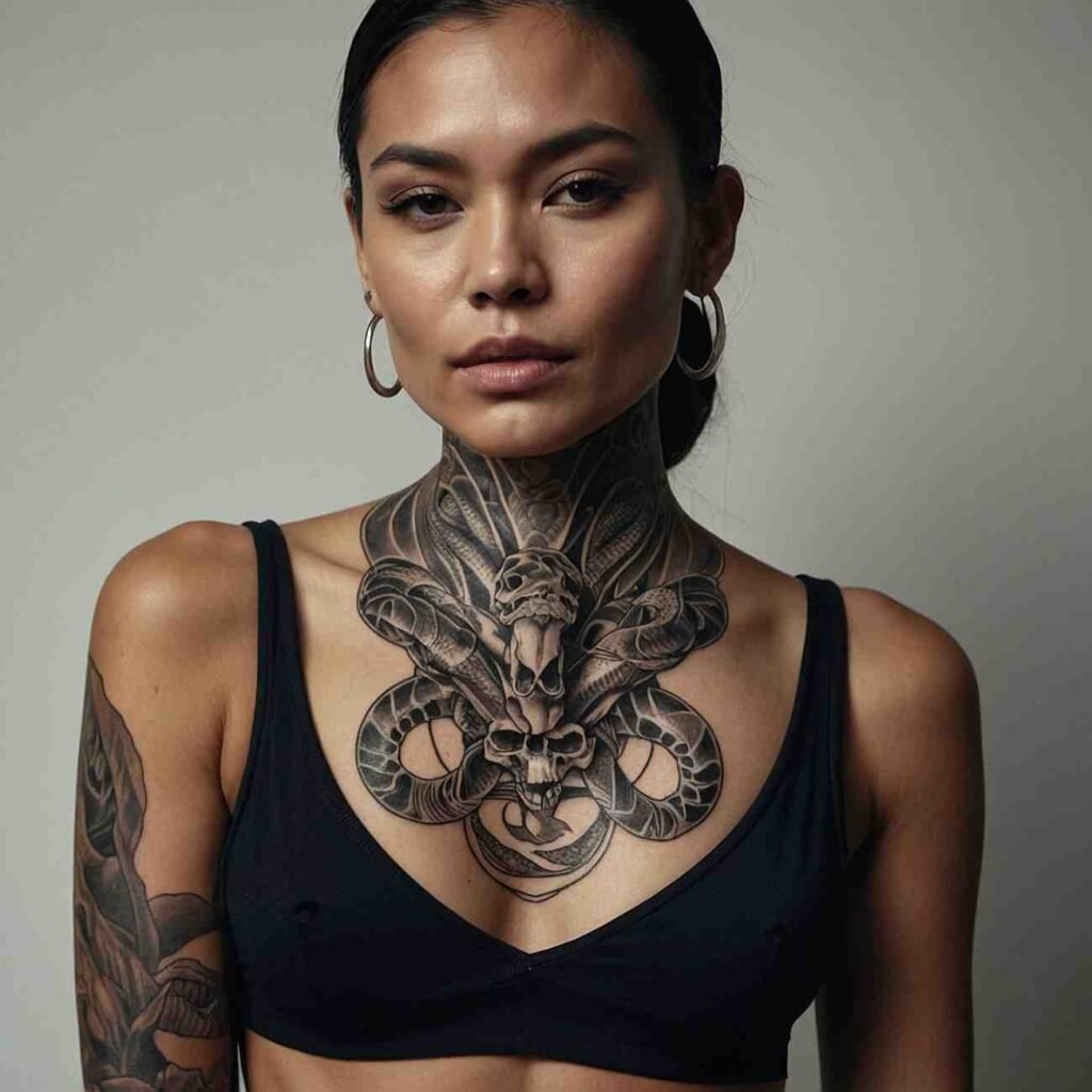 Chest neck tattoos have become increasingly popular among both men and women. These tattoos are a bold statement, blending elegance with edginess. The chest and neck are prime areas for ink due to their visibility and size, allowing for large, intricate designs that can easily flow from one area to the next.