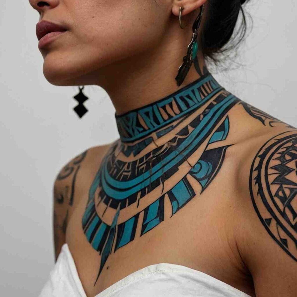 Tribal tattoos are bold and intricate. They often symbolize heritage, strength, and protection. A tribal design that flows from the chest to the neck can be personalized to reflect individual culture or beliefs.
