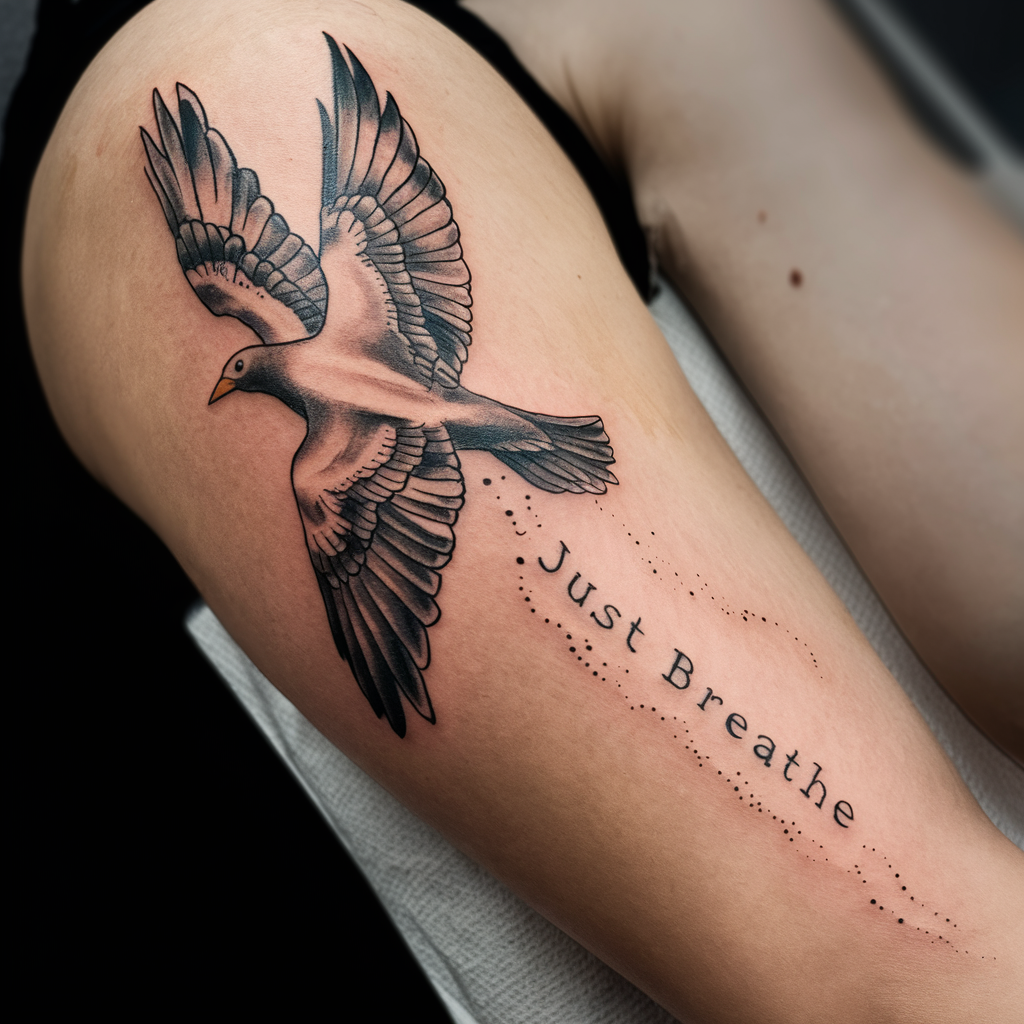Tattoo Meaning: The bird represents freedom, and the phrase “Just Breathe” acts as a gentle reminder to relax and release the burdens you carry.