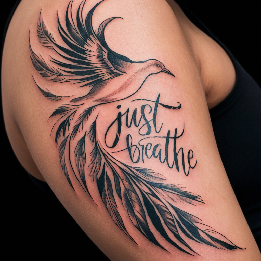 Imagine a bird soaring through the air with the words “Just Breathe” trailing behind it. This tattoo design speaks to freedom, peace, and the importance of releasing stress and tension.