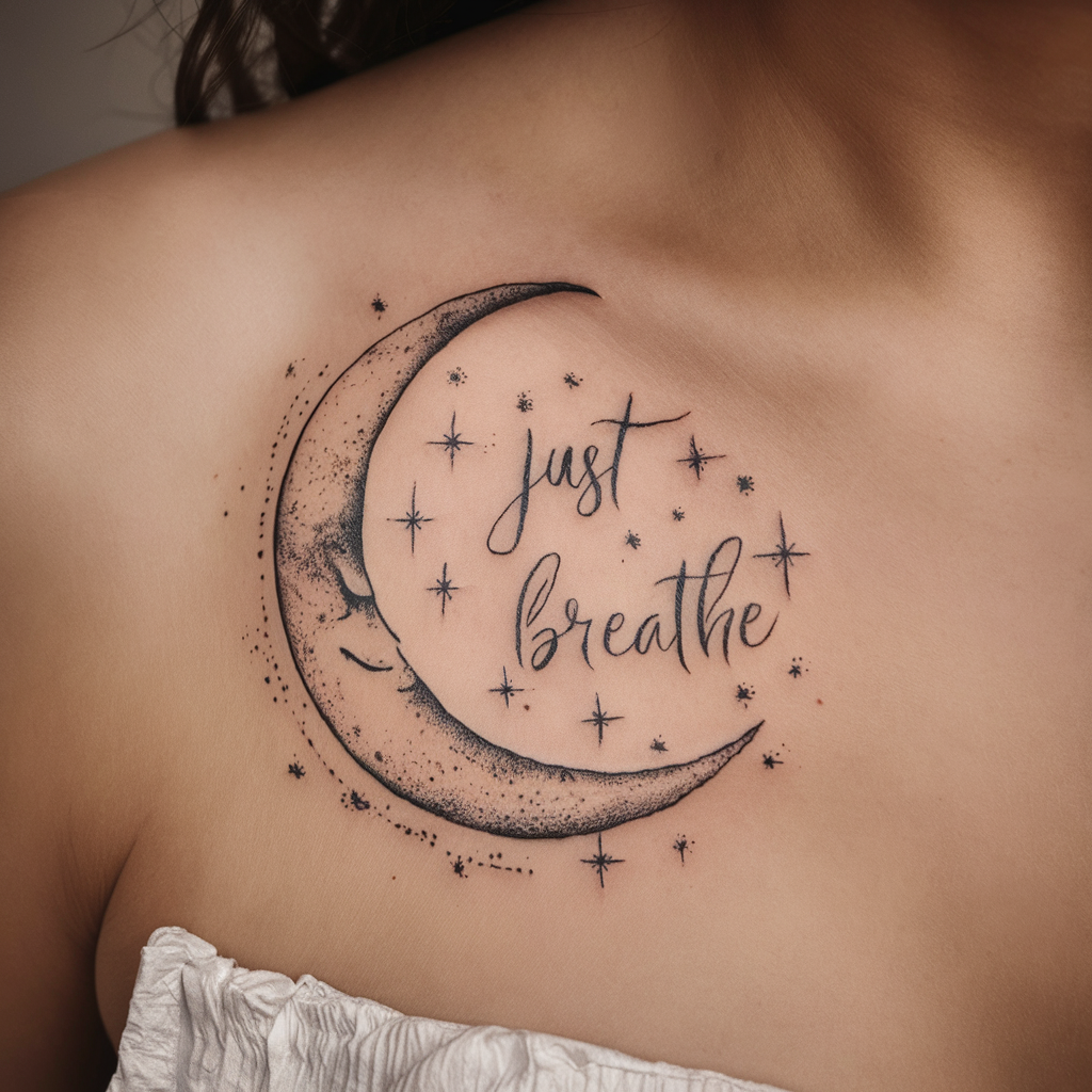 A crescent moon surrounded by stars with “Just Breathe” floating above it gives off a peaceful nighttime vibe. The moon symbolizes change and cycles, while the stars bring a sense of calm.