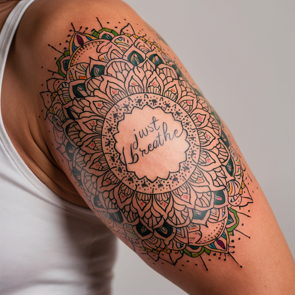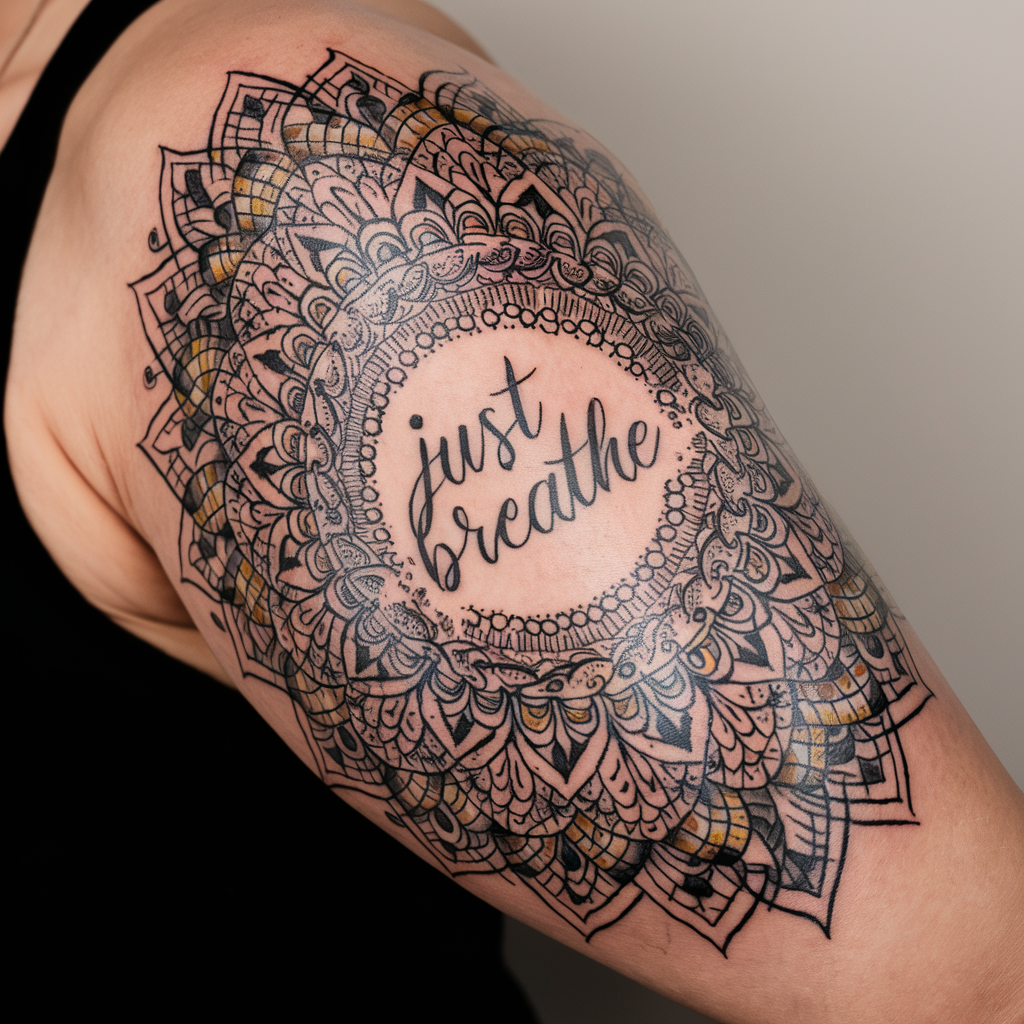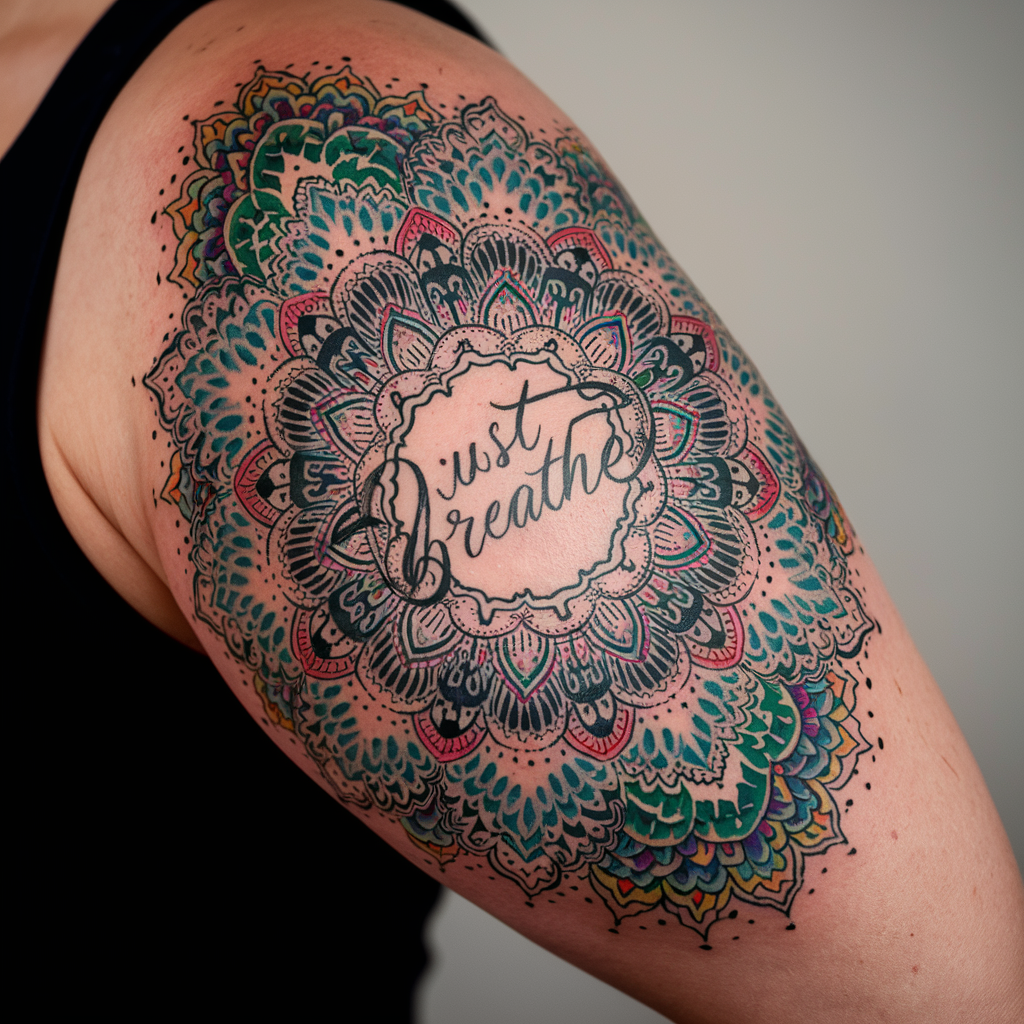 Tattoo Meaning: Mandalas represent unity and harmony, while the phrase “Just Breathe” reinforces the need for inner peace.