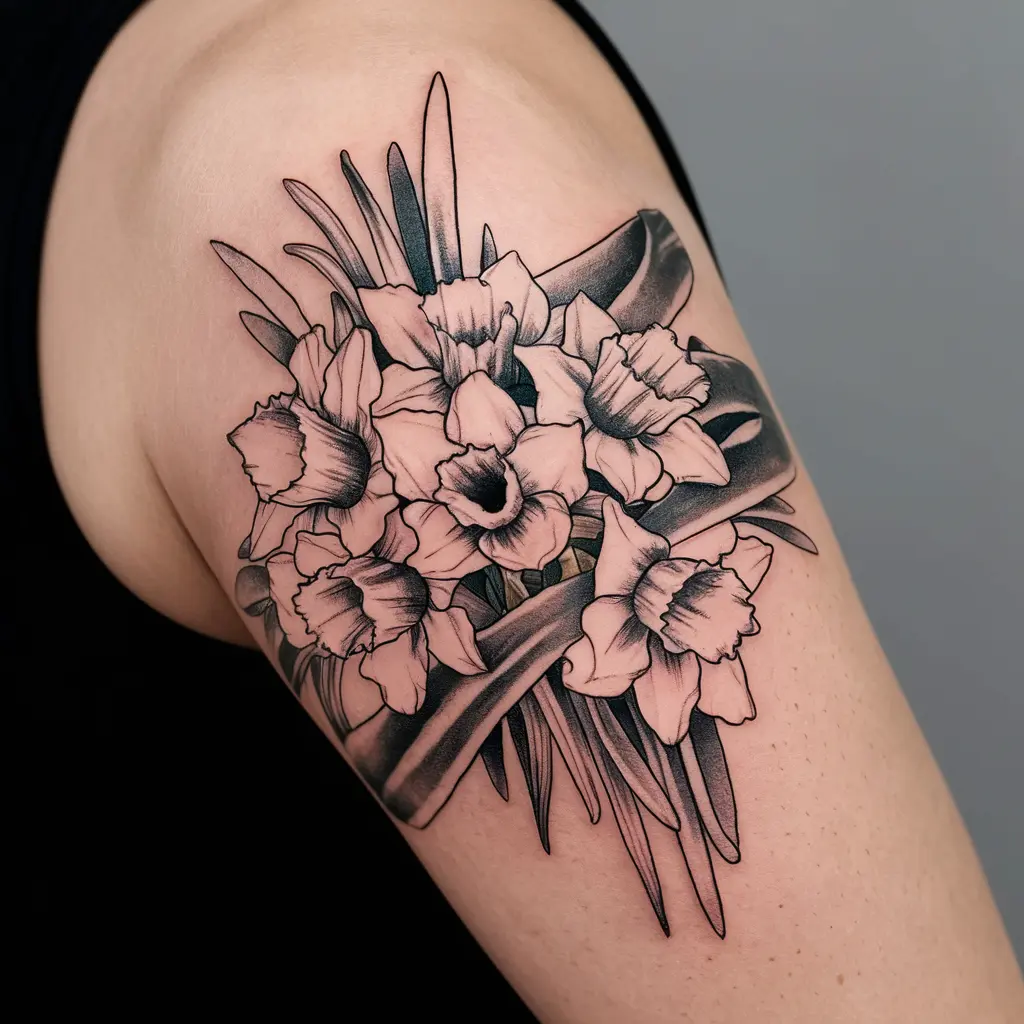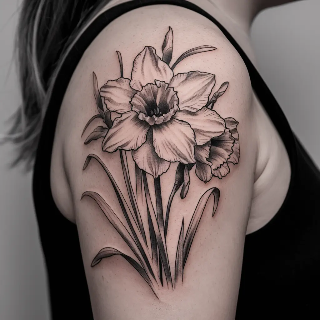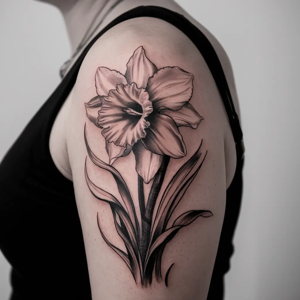 For a more classic and elegant approach, consider a black and white daffodil tattoo. This detailed design focuses on the shading and intricacy of the flower, highlighting its natural beauty without the need for color.