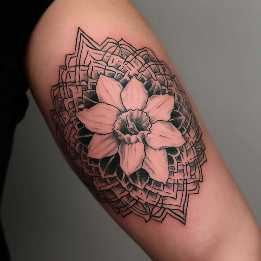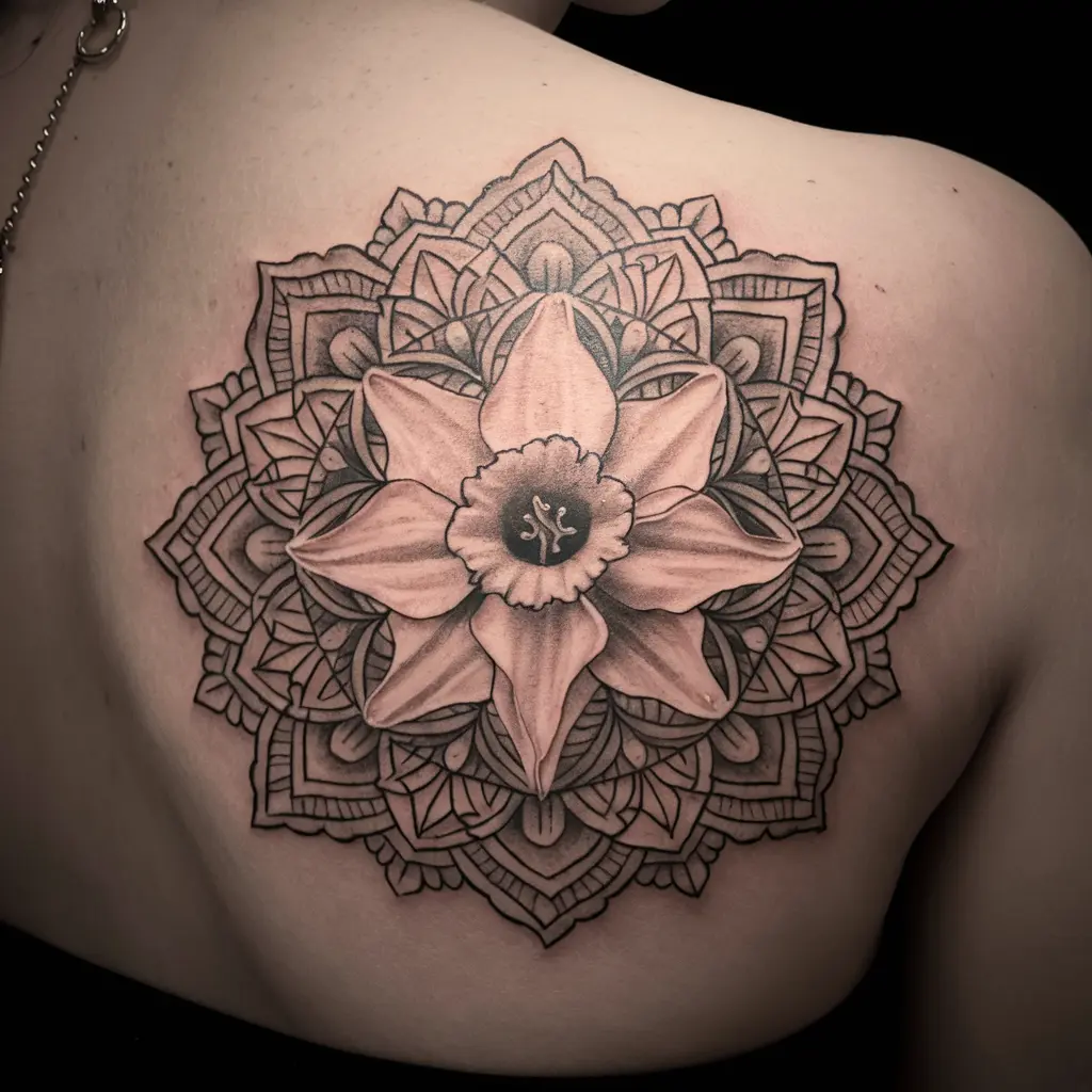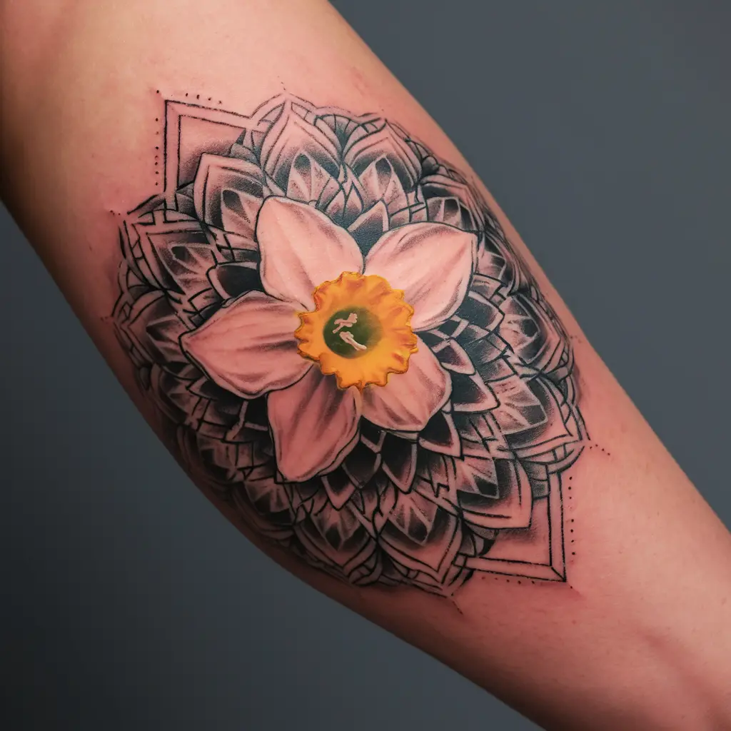 For a more spiritual design, a daffodil surrounded by a mandala is a beautiful option. The mandala represents harmony, balance, and unity, while the daffodil’s presence brings hope and renewal. Together, they make a powerful symbol of personal growth and inner peace.
