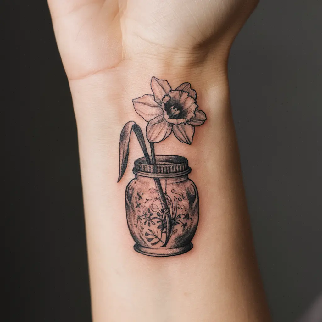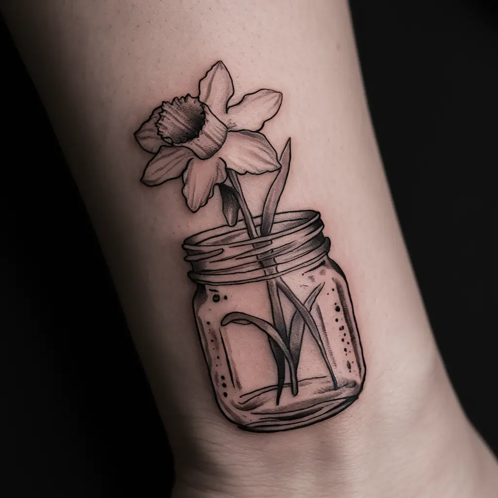 This design shows a daffodil inside a vintage jar or bottle, almost like you’ve captured a moment in time. It evokes nostalgia and the beauty of nature, symbolizing that even though flowers bloom for a short time, their impact can last forever.