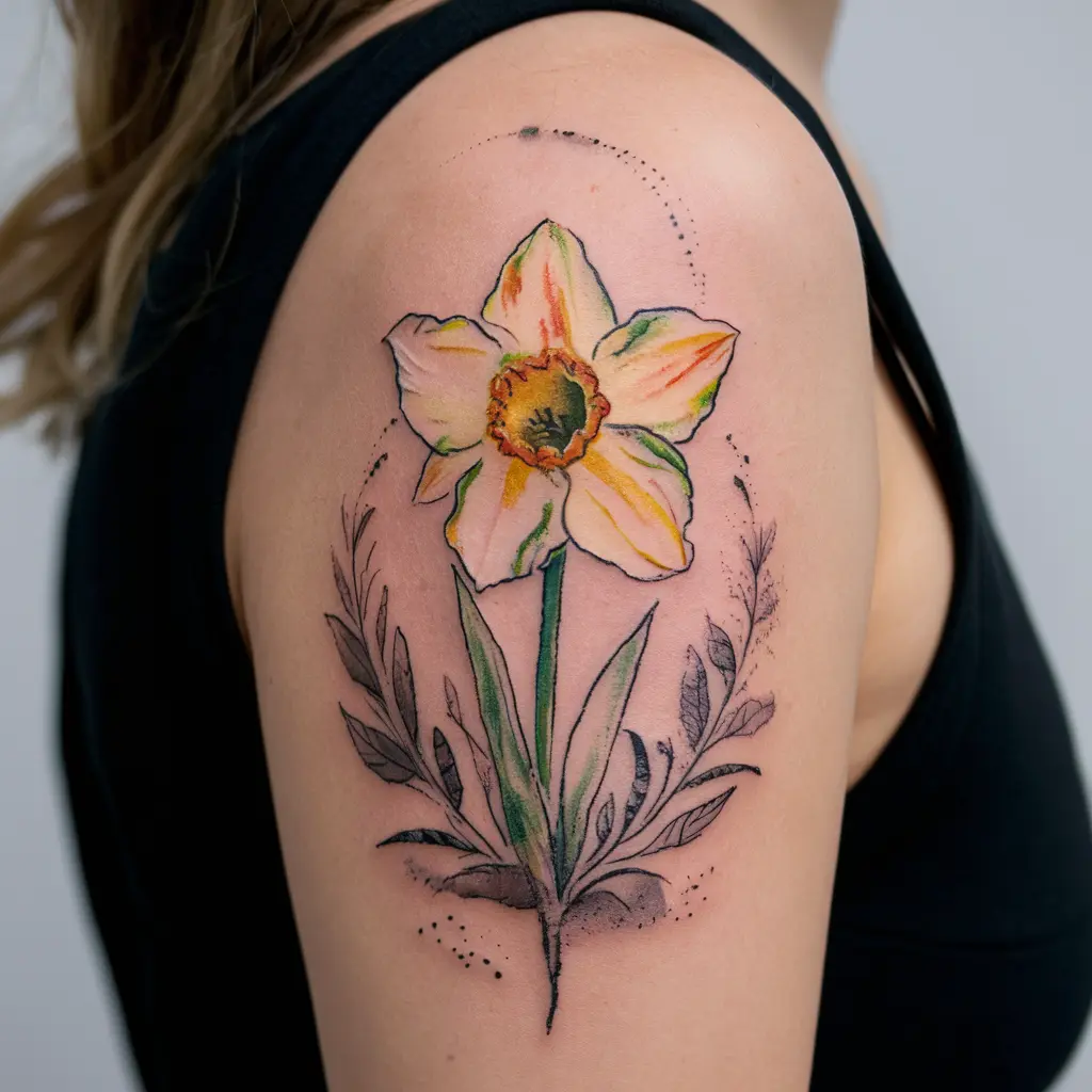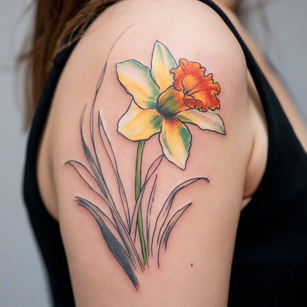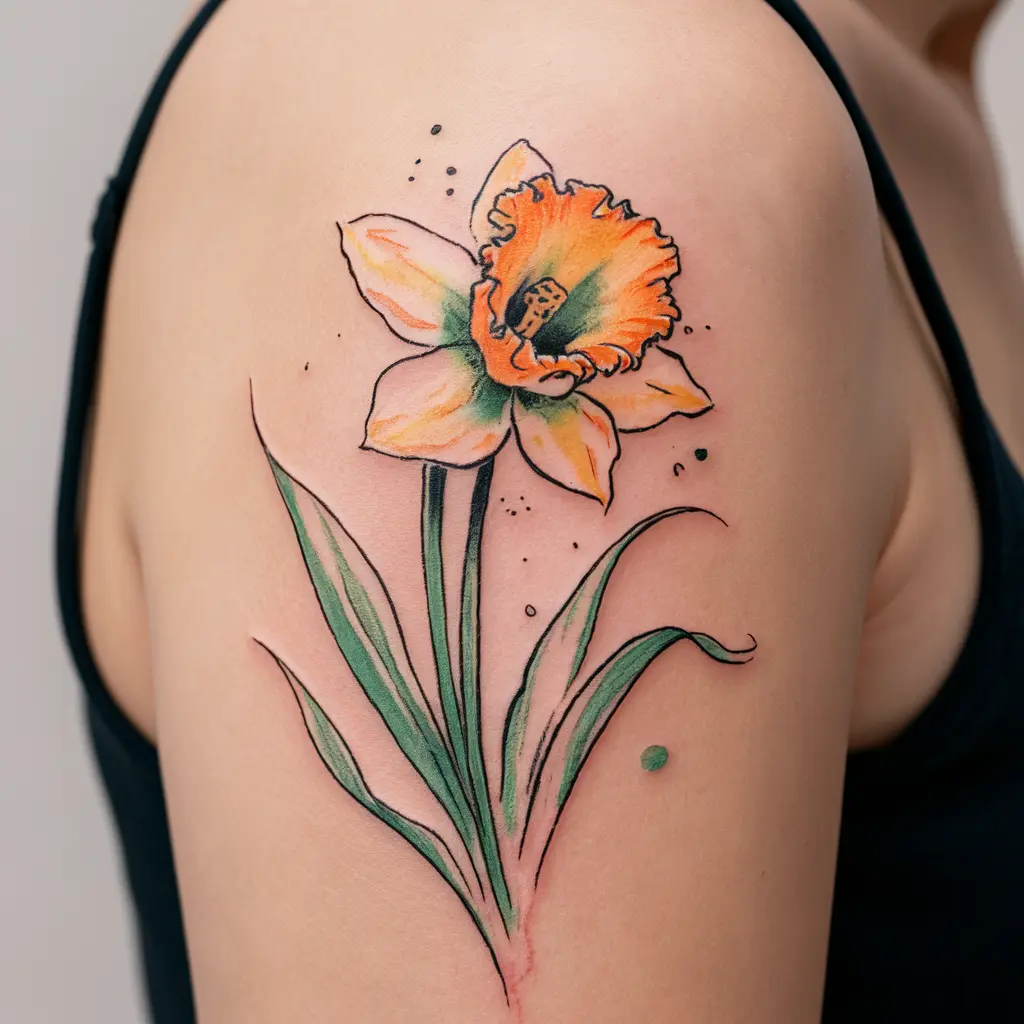 For those who enjoy vibrant colors, a watercolor daffodil tattoo will make a bold statement. Soft yellow and orange petals, combined with splashes of green, give this design a dreamy, artistic feel. It’s as though the flower has just bloomed right onto your skin.