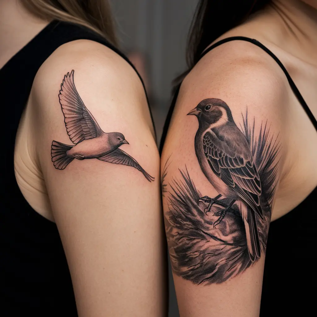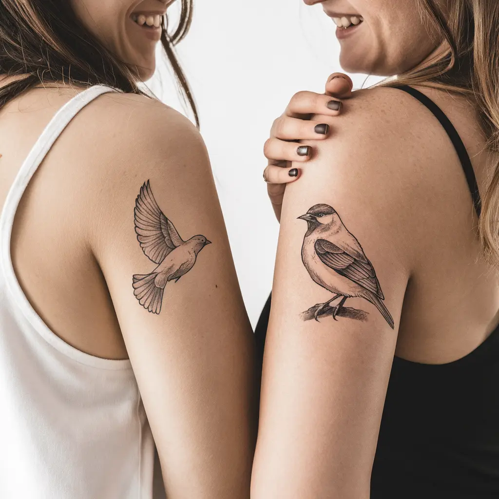 If you and your best friend share a love for freedom and adventure, matching bird tattoos could be a perfect choice. One of you can get a flying bird, while the other has a perched bird. Together, they represent a sense of freedom and unity.