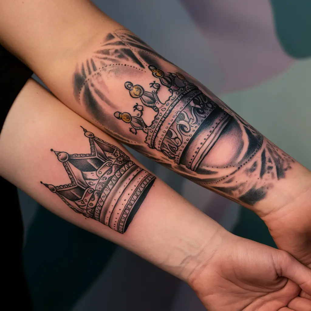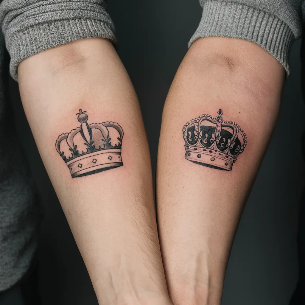 For those who want to feel like royalty, king and queen crown tattoos make for perfect matching designs. One of you can get a king crown, and the other can get a queen crown. This design symbolizes loyalty, royalty, and strength.