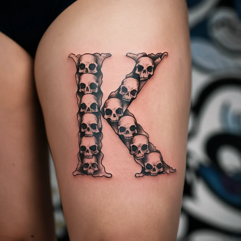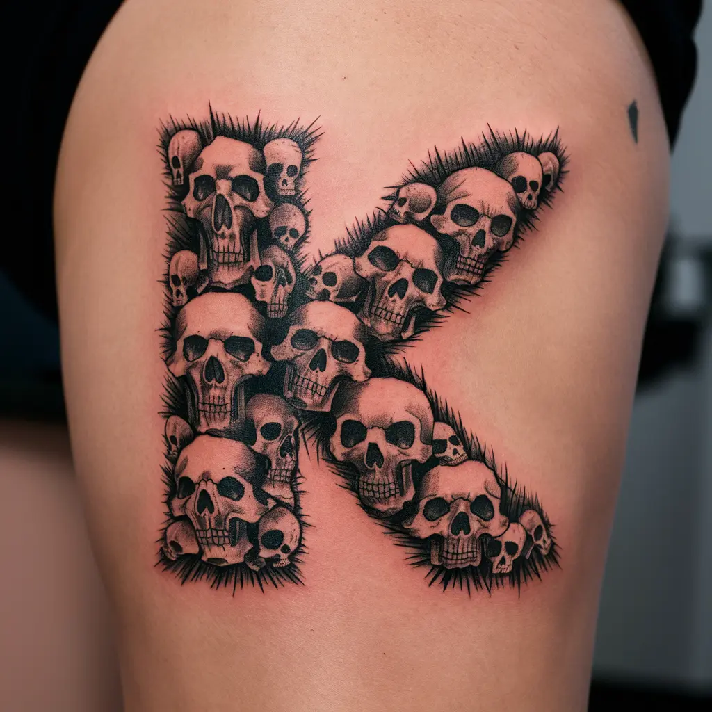 For those who love a more rebellious design, a skull “K” tattoo might be just the thing. The letter “K” is made from or decorated with skulls, creating a bold, edgy look.