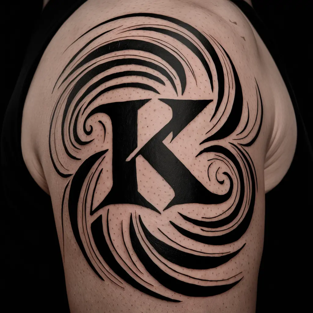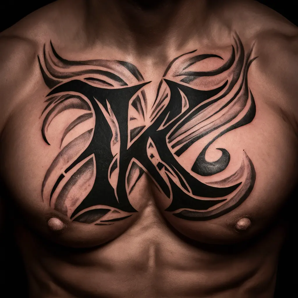 A tribal “K” tattoo features bold black lines and curves, making it a great choice for those who love deep symbolism and strong, warrior-like designs.