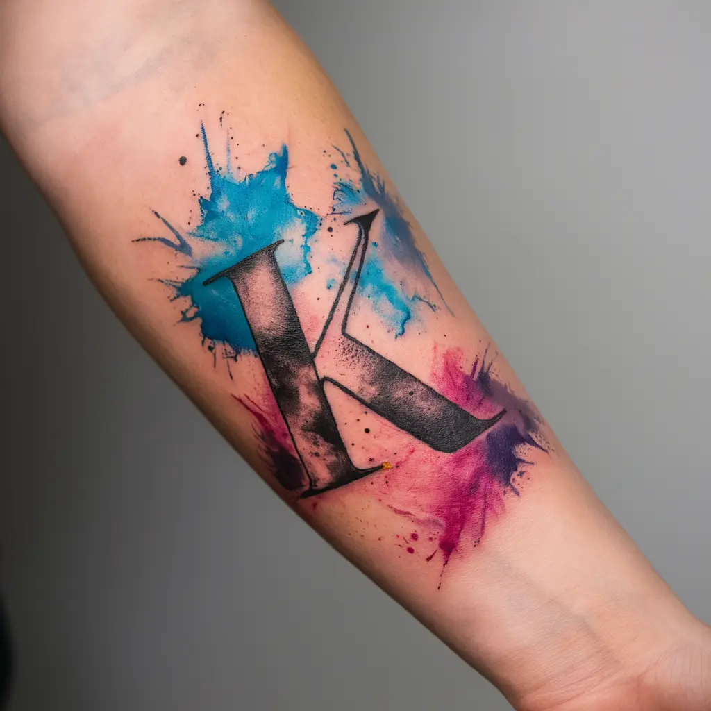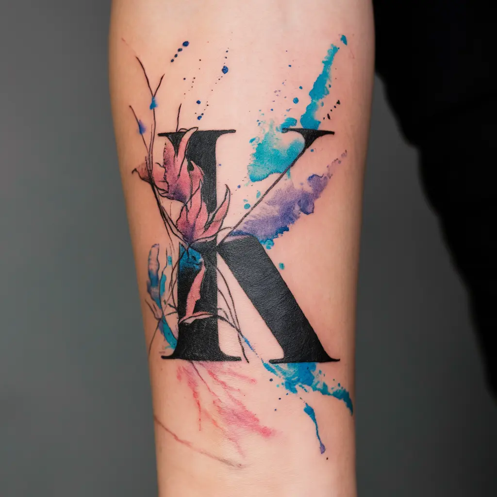 If you love colors and creativity, a watercolor “K” tattoo could be perfect for you. The letter is accompanied by a wash of vibrant colors, blending seamlessly into a beautiful abstract design.