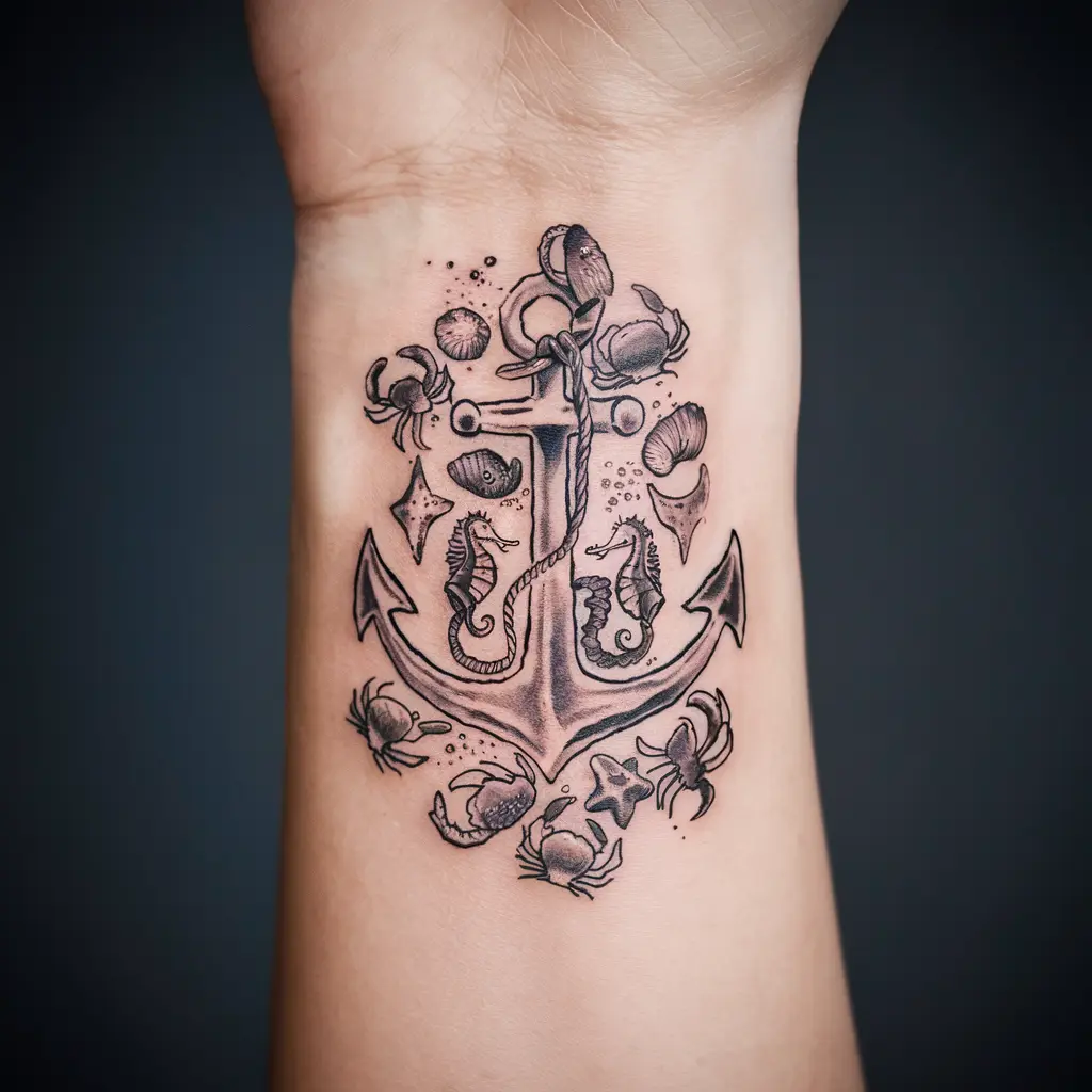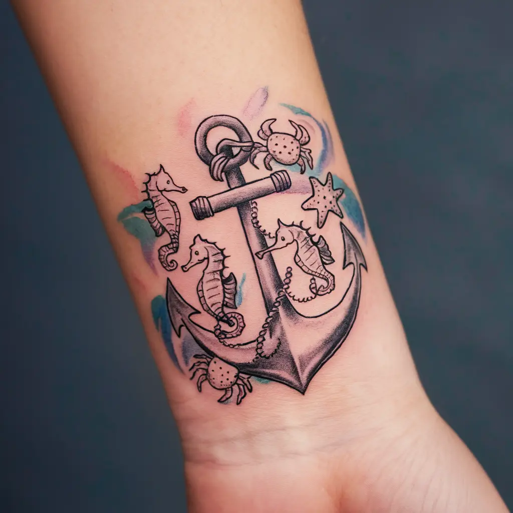 A classic anchor tattoo can be combined with various sea creatures such as seahorses, crabs, and starfish. This design represents stability, hope, and a connection to the sea.