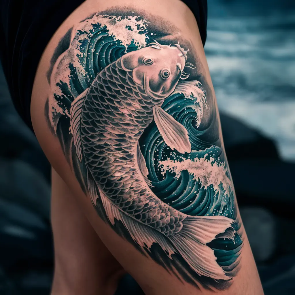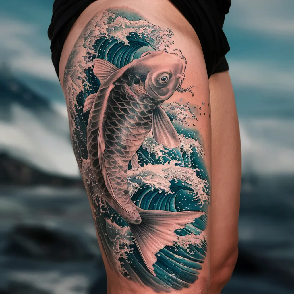 Tattoo Meaning: The koi fish symbolizes perseverance, transformation, and good fortune. Combined with ocean waves, it suggests overcoming obstacles.
