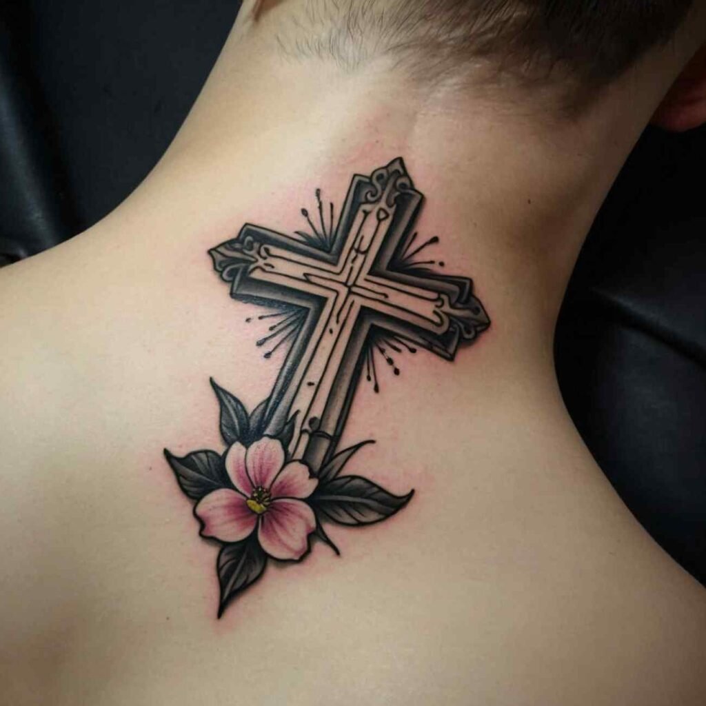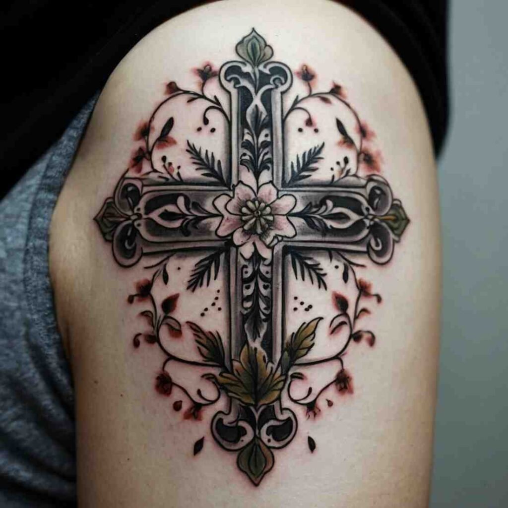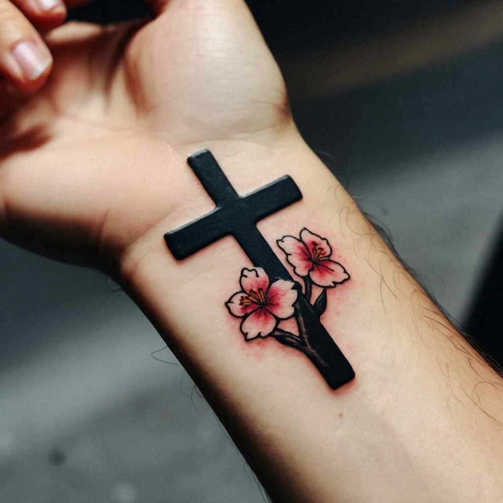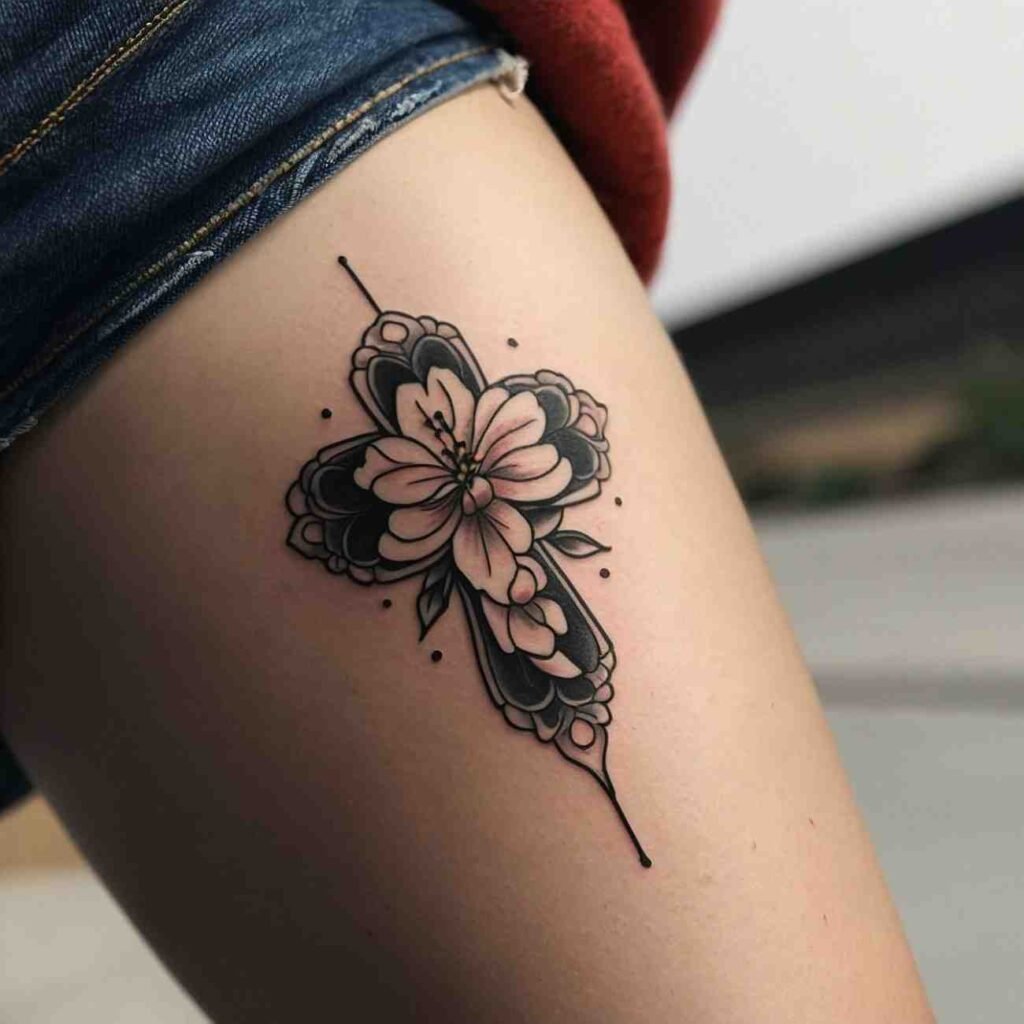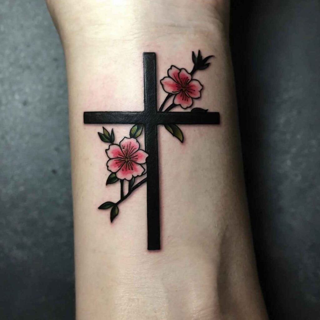 This tattoo style is perfect for those who want to carry a piece of their faith, blended with the natural beauty of flowers. The cross brings spiritual meaning, while flowers add a touch of softness and individuality to the design.