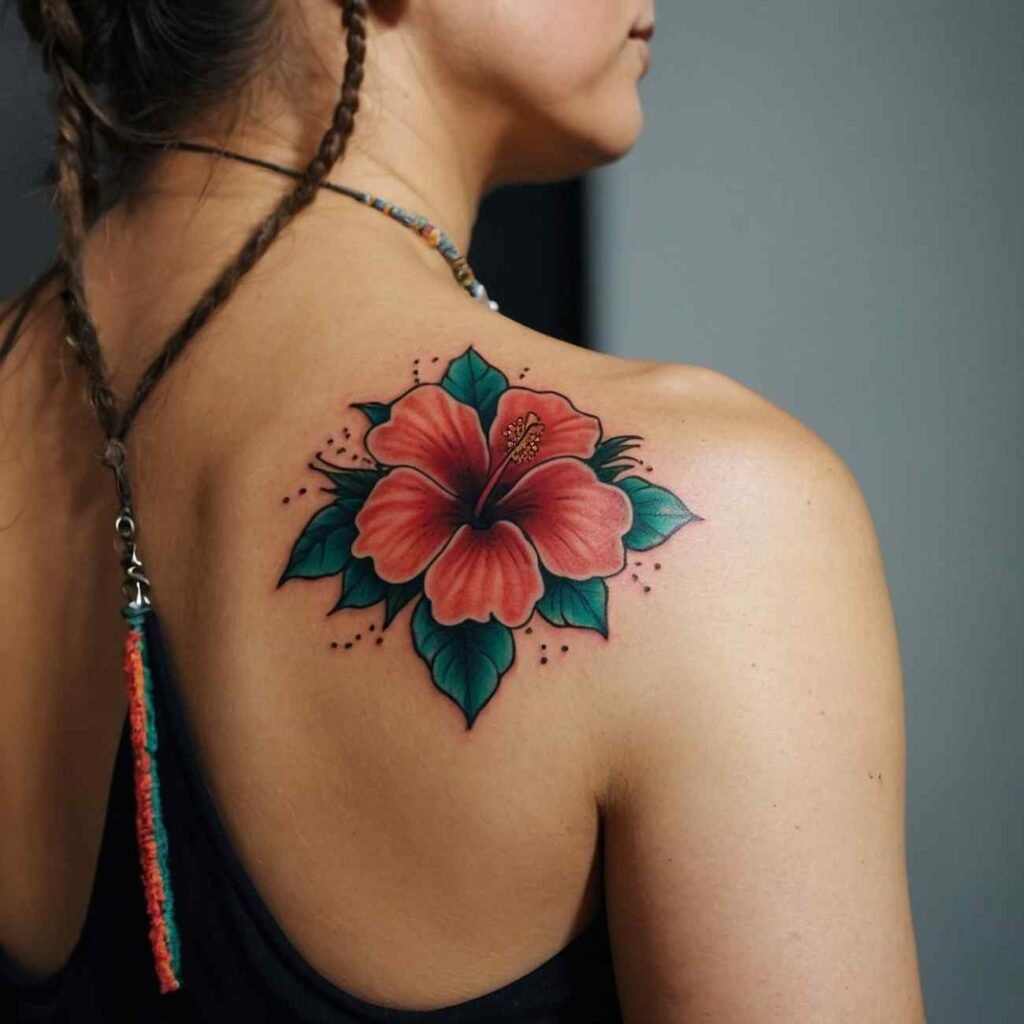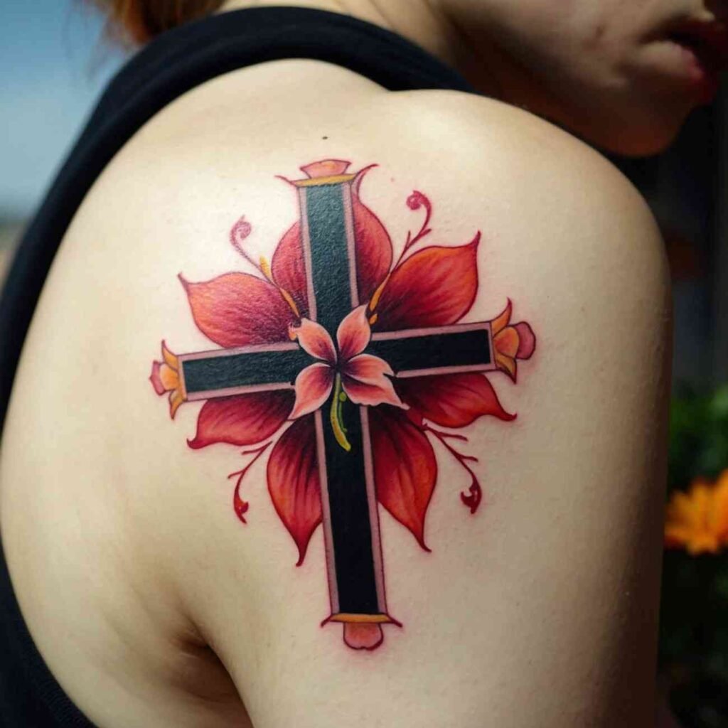 Hibiscus flowers are bright and bold, symbolizing delicate beauty and a joyful spirit. When added to a cross tattoo, they give off an island-inspired vibe, making the design feel fresh, vibrant, and filled with happiness.