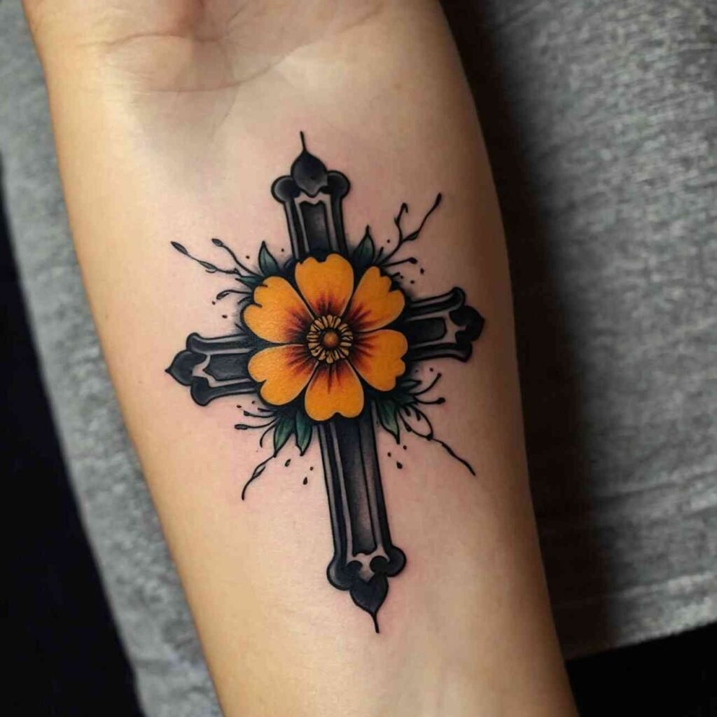 Marigolds are often associated with the sun and warmth. When paired with a cross, they represent light, life, and protection. This design can be a bold reminder of keeping faith even during tough times.