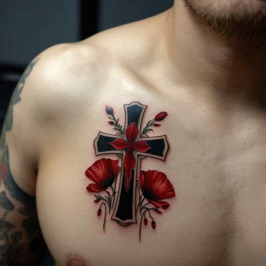 Poppies often symbolize remembrance, particularly for those who have passed away. A cross with poppies can serve as a memorial tattoo, honoring loved ones while also carrying a strong message of faith and eternal life.