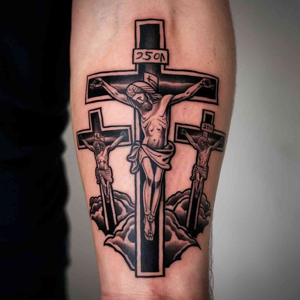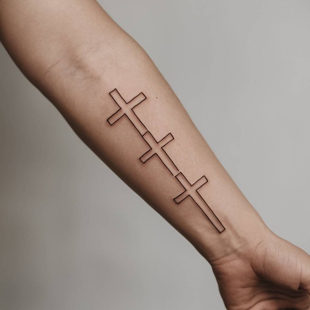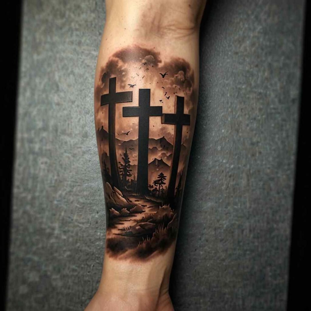 This tattoo represents the crucifixion of Jesus Christ and the two thieves on either side of him. The central cross is usually larger to symbolize Jesus, while the two smaller crosses represent the thieves. This design holds deep religious meaning for Christians and serves as a powerful reminder of sacrifice and salvation. Placing this design on the forearm keeps it visible and personal, reminding the wearer of their faith daily.
