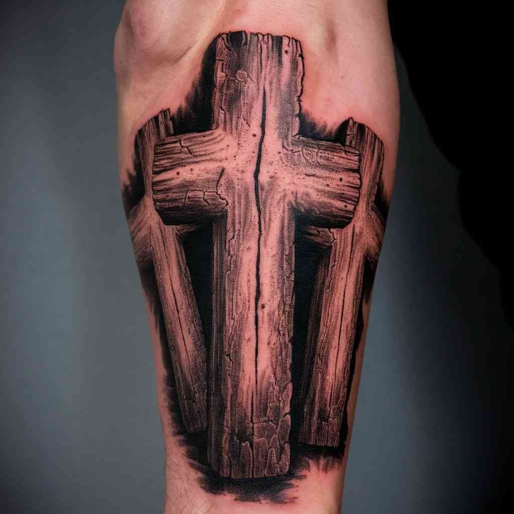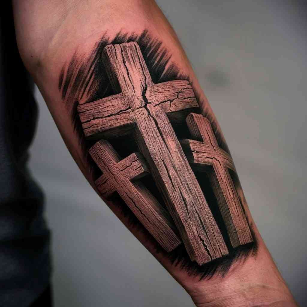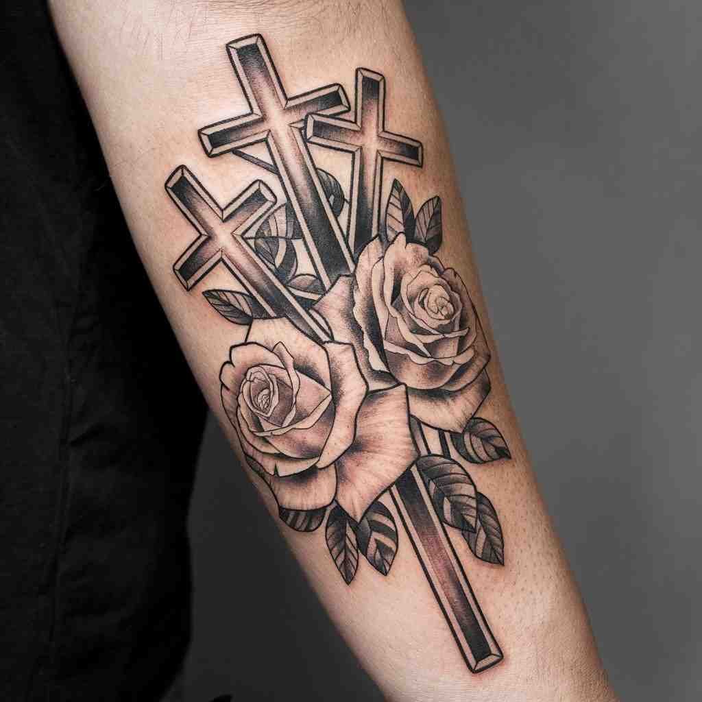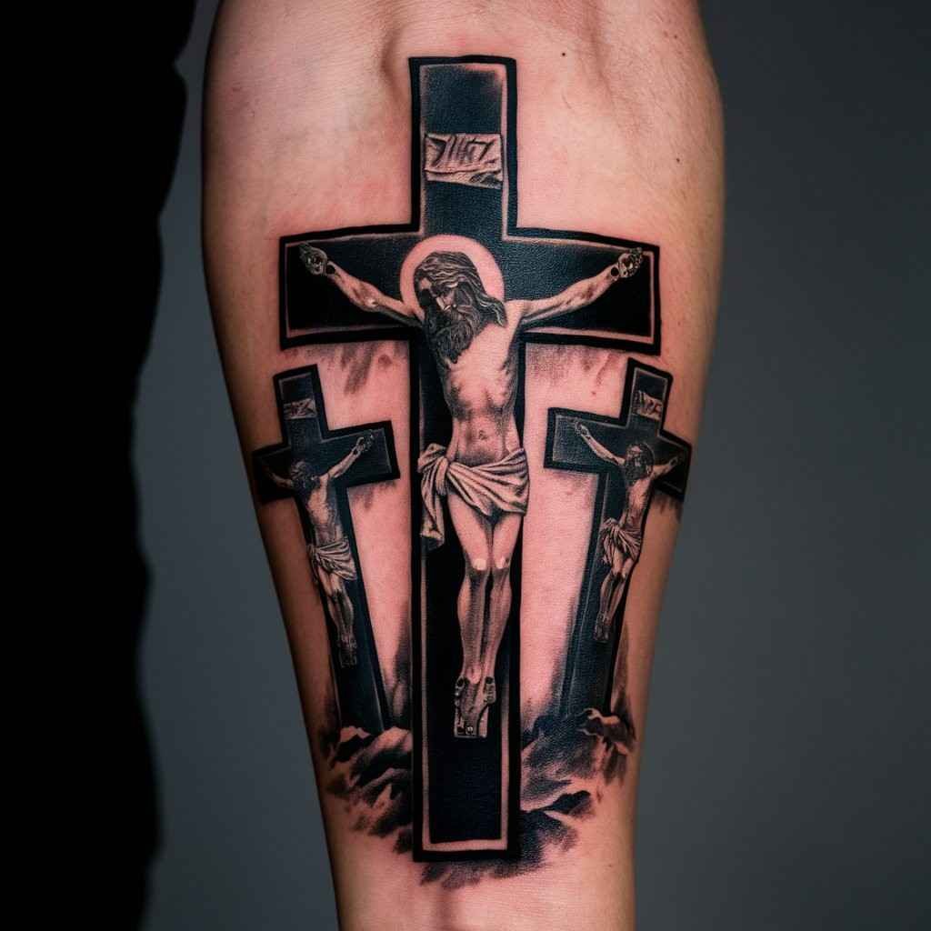 This tattoo represents the crucifixion of Jesus Christ and the two thieves on either side of him. The central cross is usually larger to symbolize Jesus, while the two smaller crosses represent the thieves. This design holds deep religious meaning for Christians and serves as a powerful reminder of sacrifice and salvation. Placing this design on the forearm keeps it visible and personal, reminding the wearer of their faith daily.