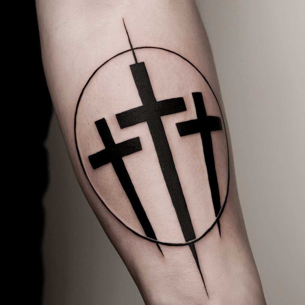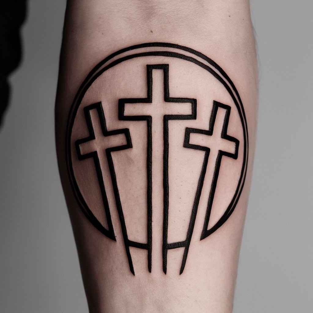 A circular design brings unity and wholeness to the three cross tattoo. This style often symbolizes eternity, representing the everlasting nature of faith or family. The circular element can also represent the cycle of life, and it’s a beautiful way to tie the three crosses together in one cohesive design.
