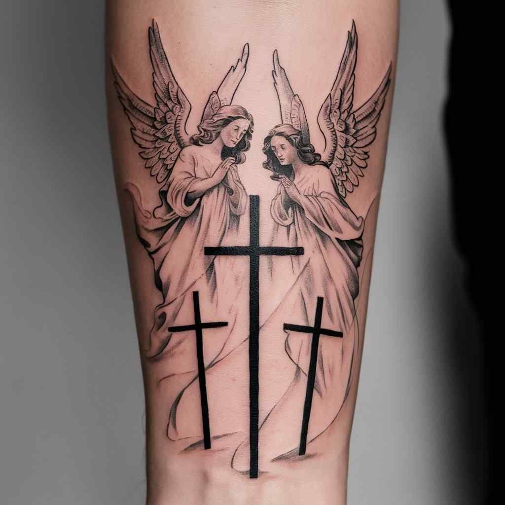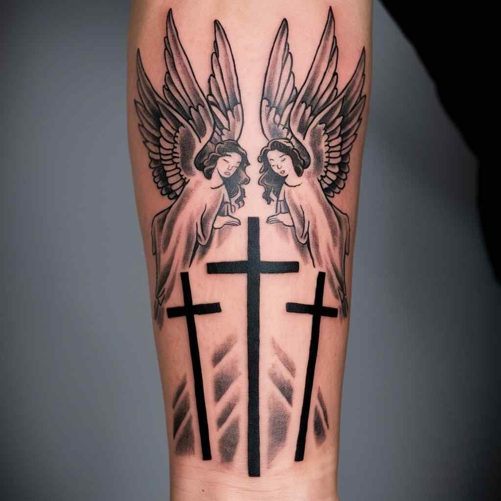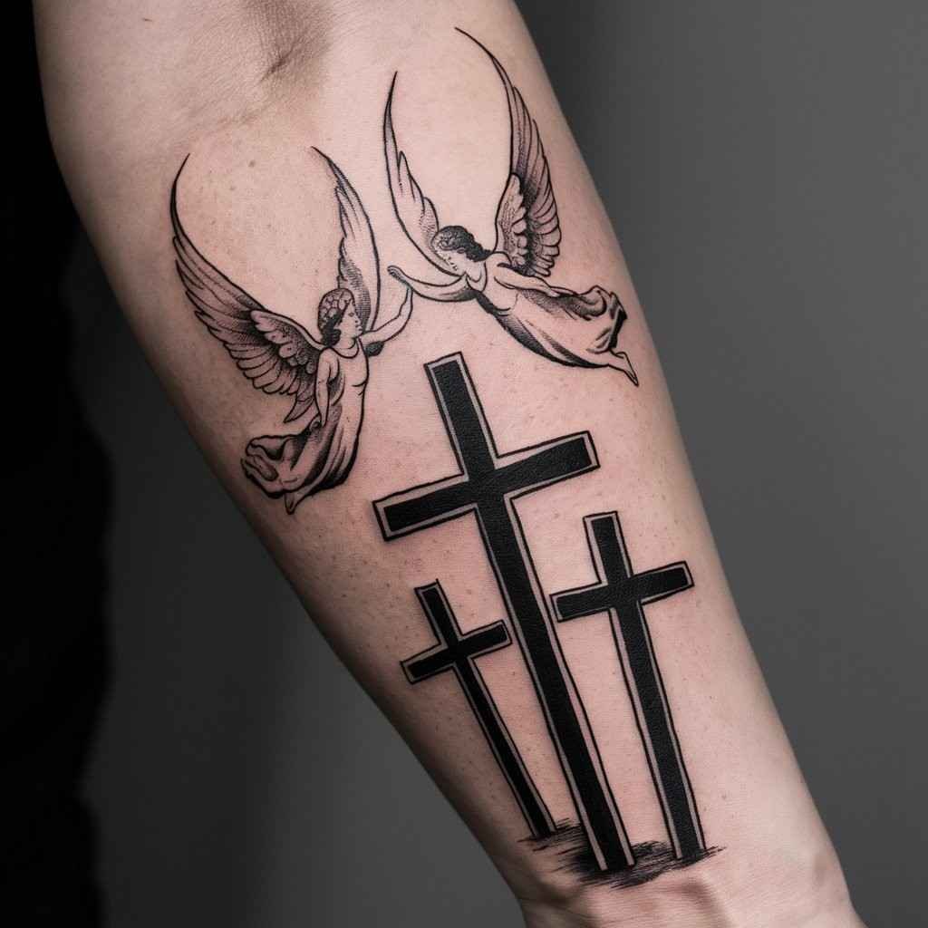Angels can be added to this design to symbolize protection and divine guidance. This tattoo often shows angels hovering around or near the crosses, acting as guardians. It’s a beautiful way to blend religious elements and make the tattoo more personal.