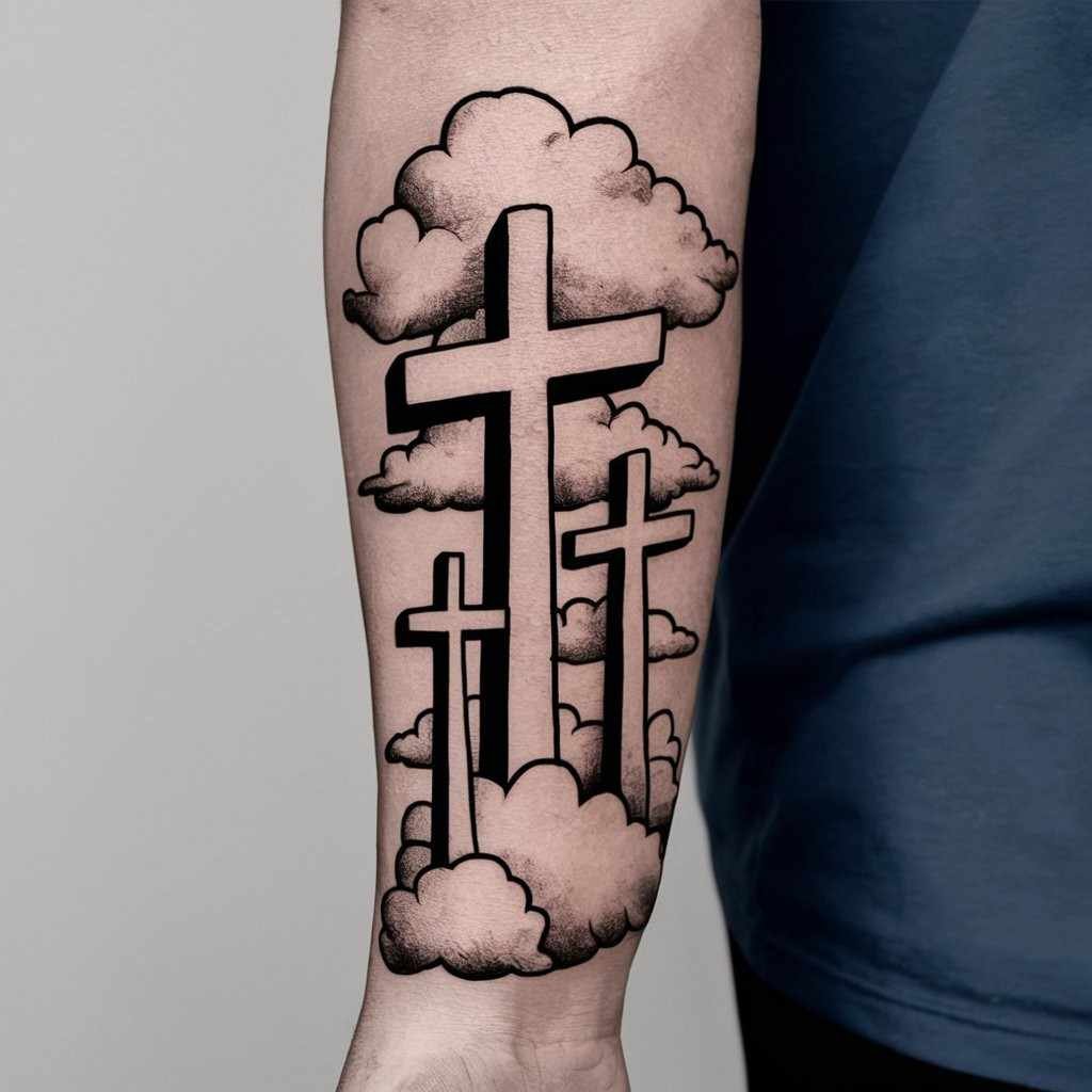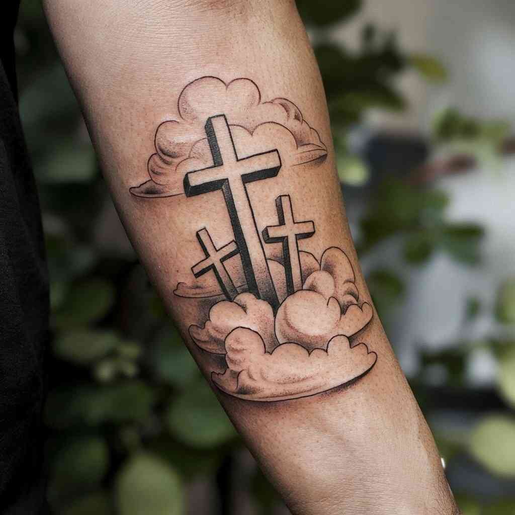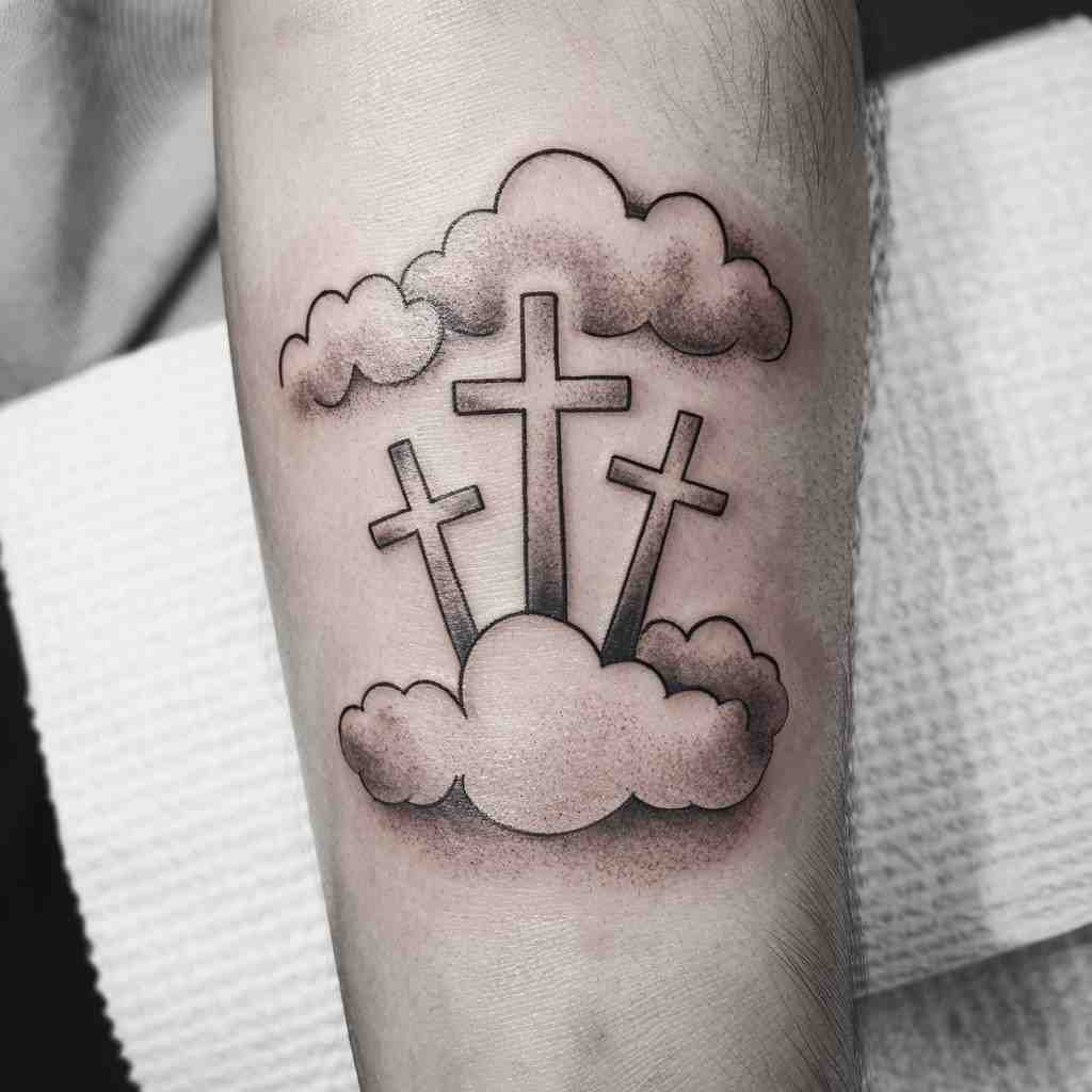 Adding clouds to the design creates a heavenly and peaceful vibe. The crosses can appear to be floating in the clouds, representing the idea of ascension or divine presence. This tattoo is ideal for someone looking for a spiritual and calming design.