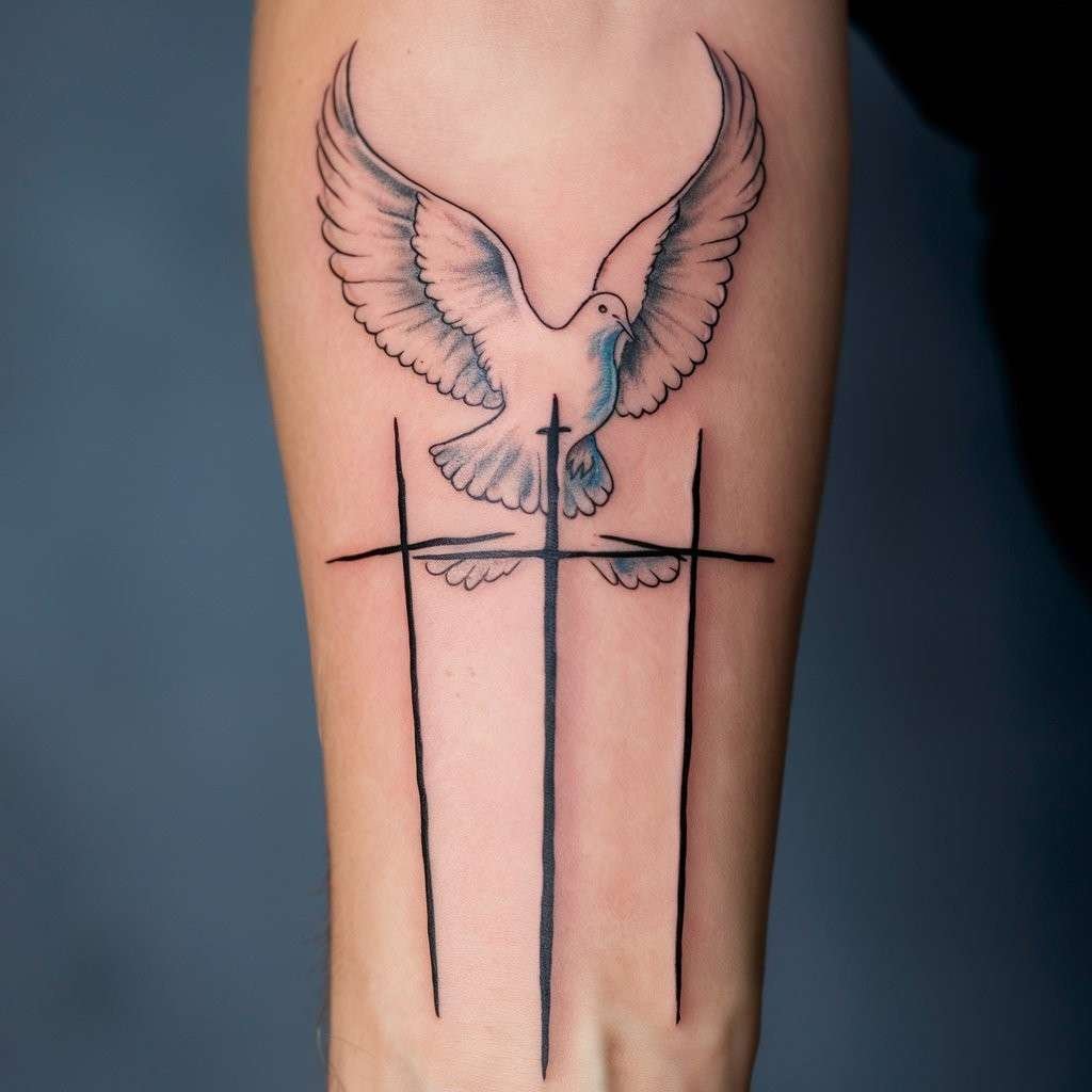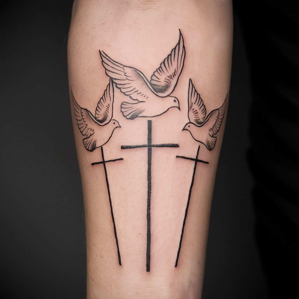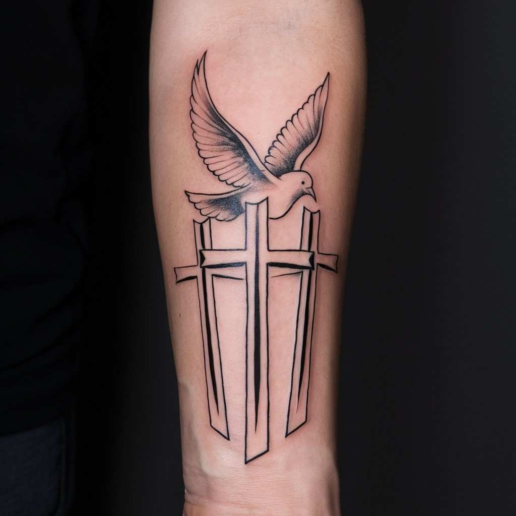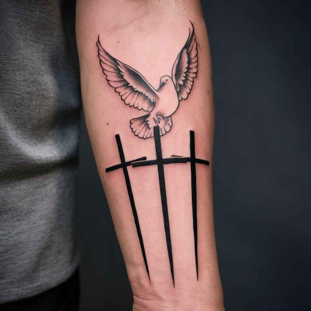 Adding a dove to your three cross tattoo brings in the symbol of peace and the Holy Spirit. This design is a great way to add more religious significance. The dove often appears flying above or between the crosses, symbolizing divine intervention or spiritual guidance. It’s an elegant and peaceful design for the forearm.
