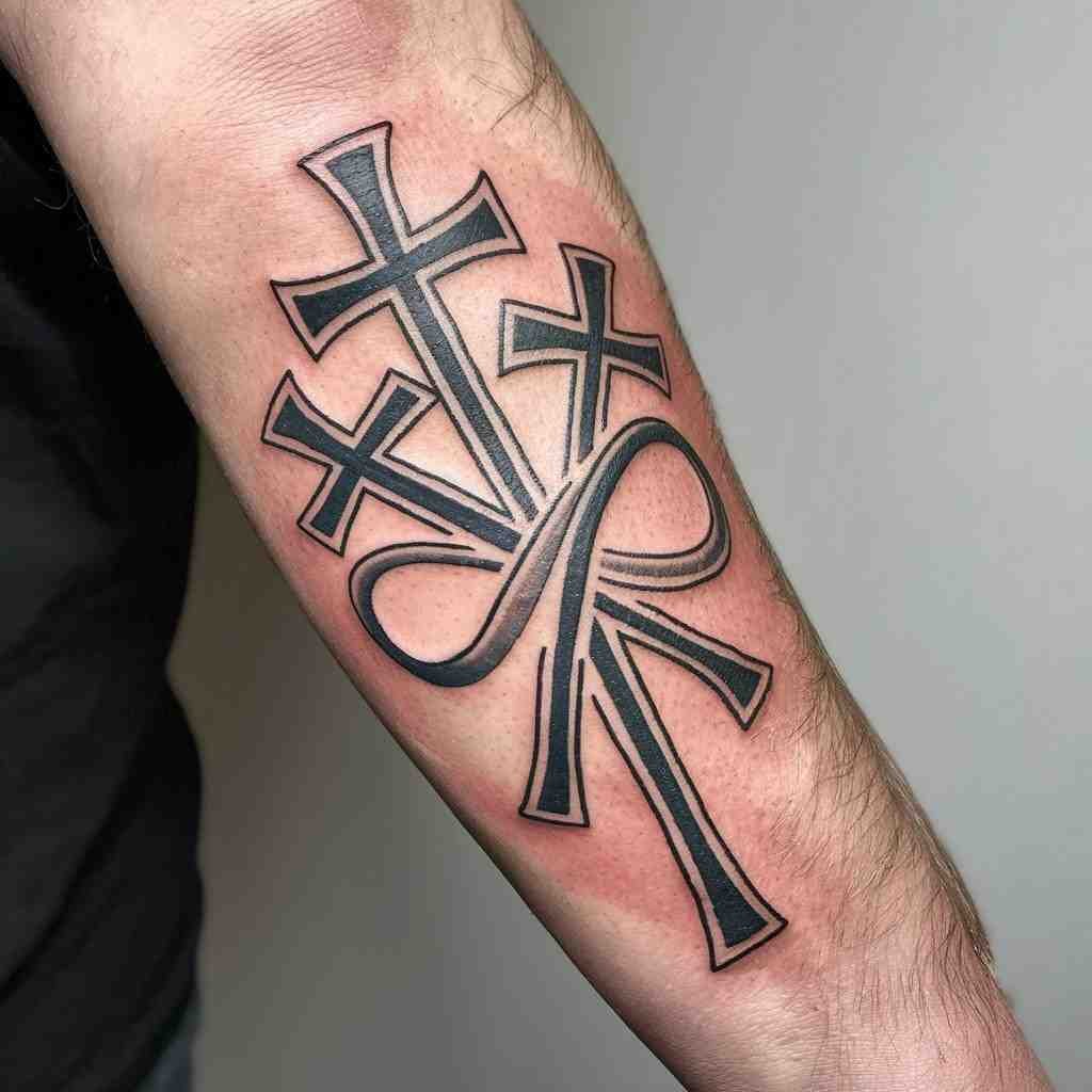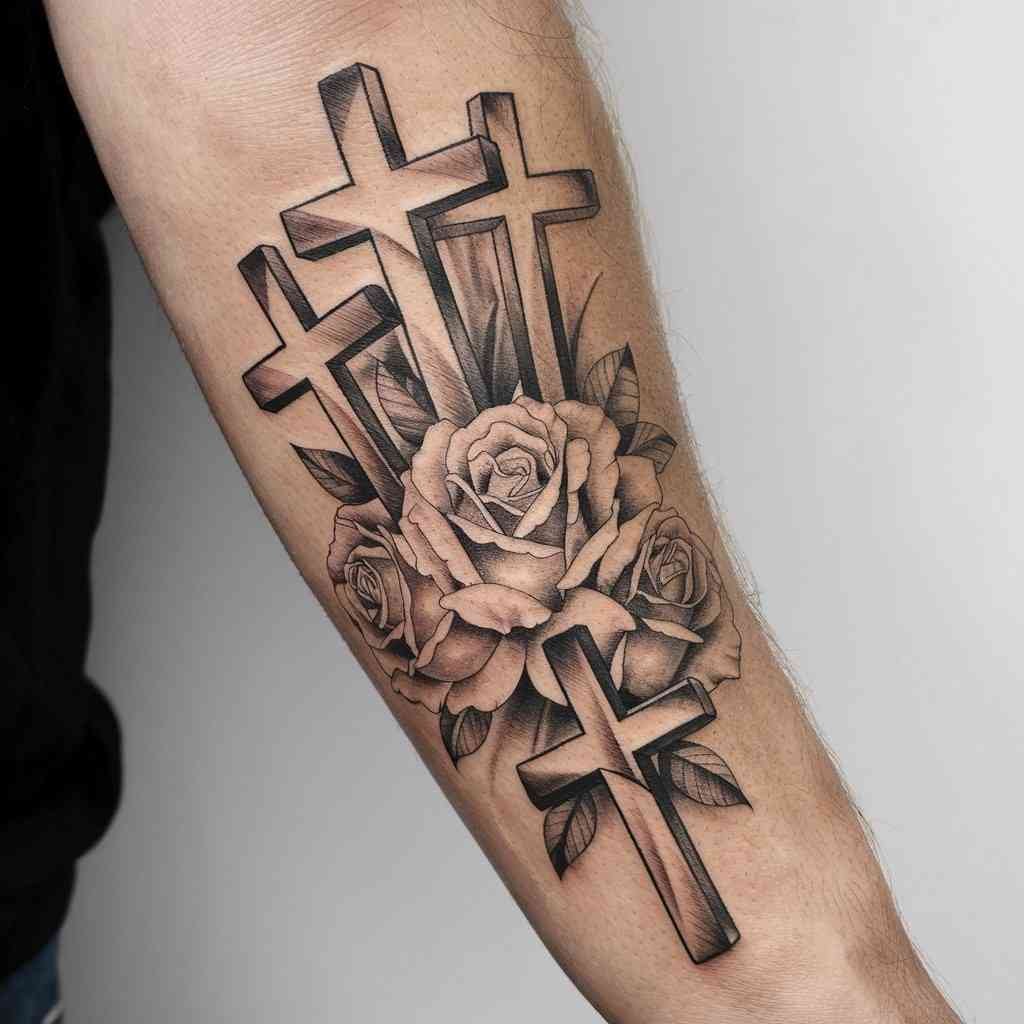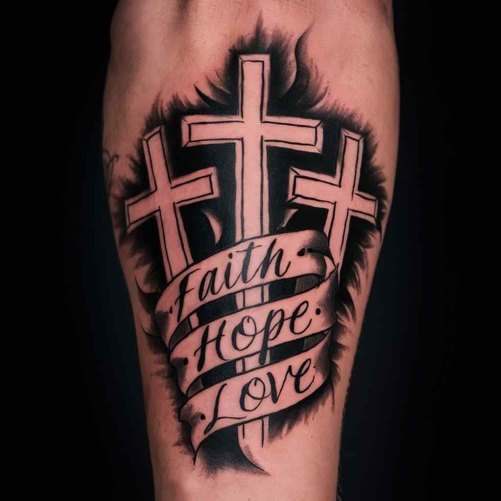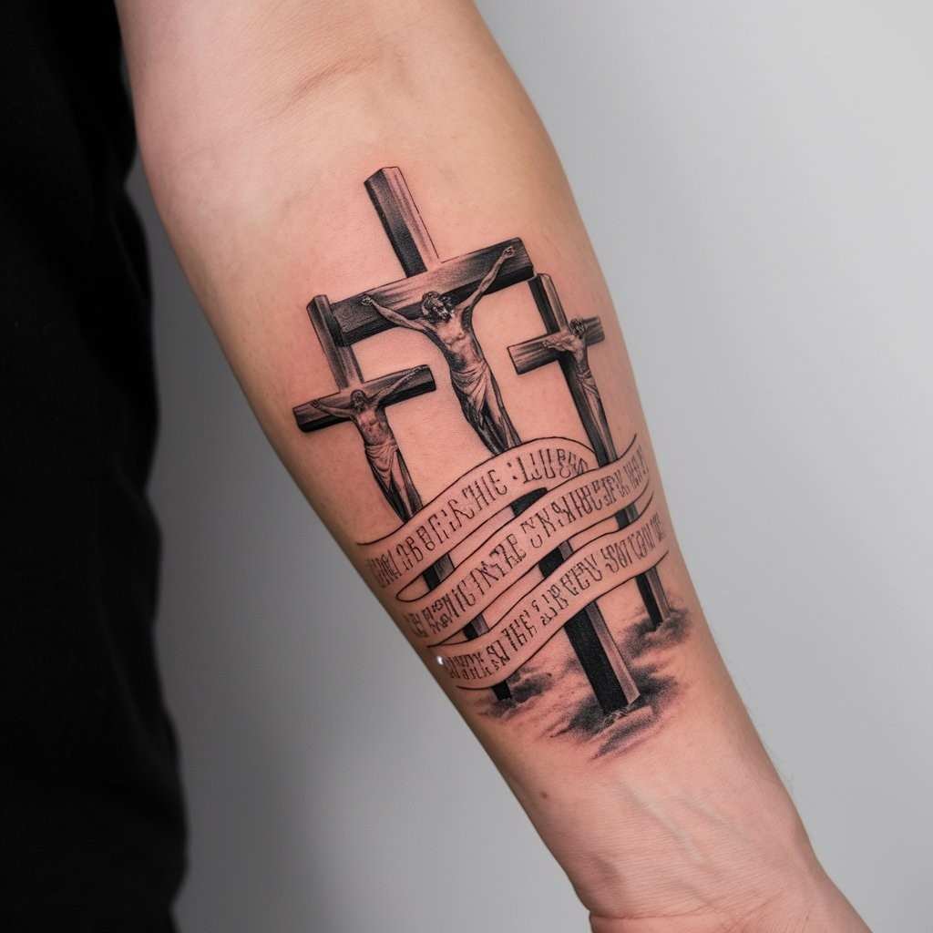 This design incorporates a banner that wraps around the crosses, often containing words like “Faith,” “Hope,” or “Love.” The banner adds a personal message to the tattoo, making it unique to you. It’s a great way to include a special quote or a name that holds meaning. The placement on the forearm ensures the message is clearly visible and easily readable.