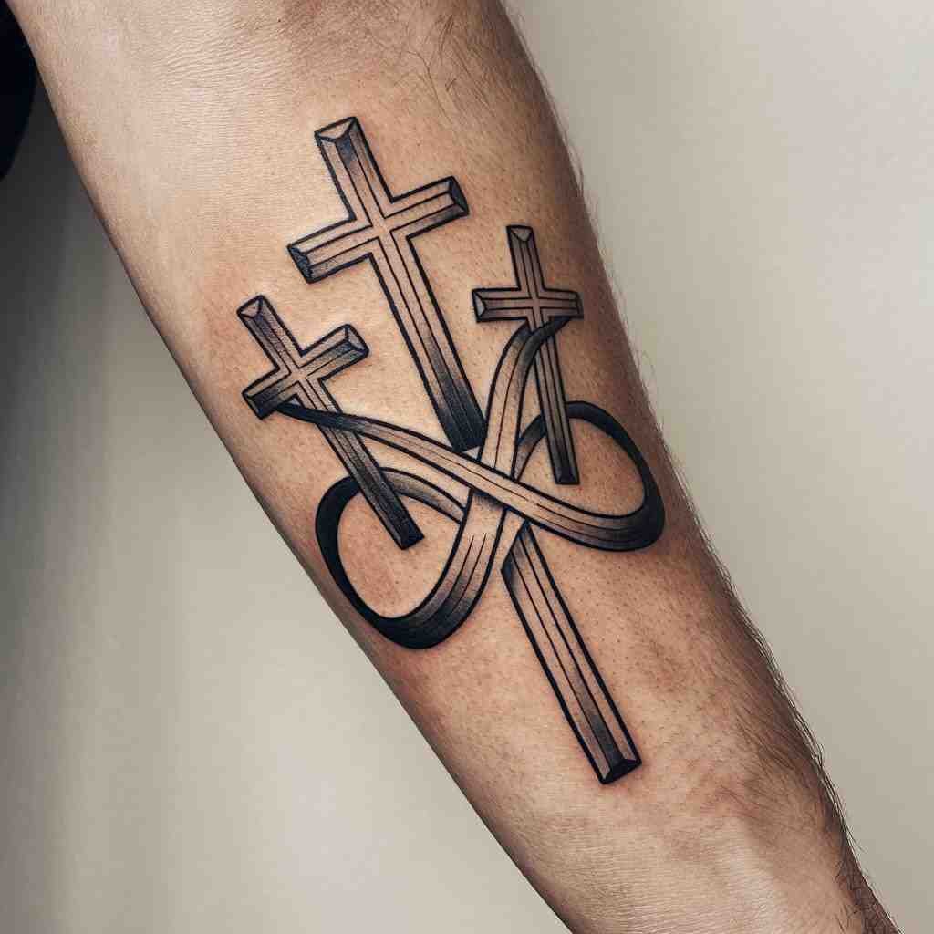 The infinity symbol adds a sense of eternity to the three cross tattoo. This design often signifies eternal faith or everlasting love. The infinity loop can wrap around the crosses, creating a seamless and continuous design. It’s a modern and thoughtful way to represent your beliefs.