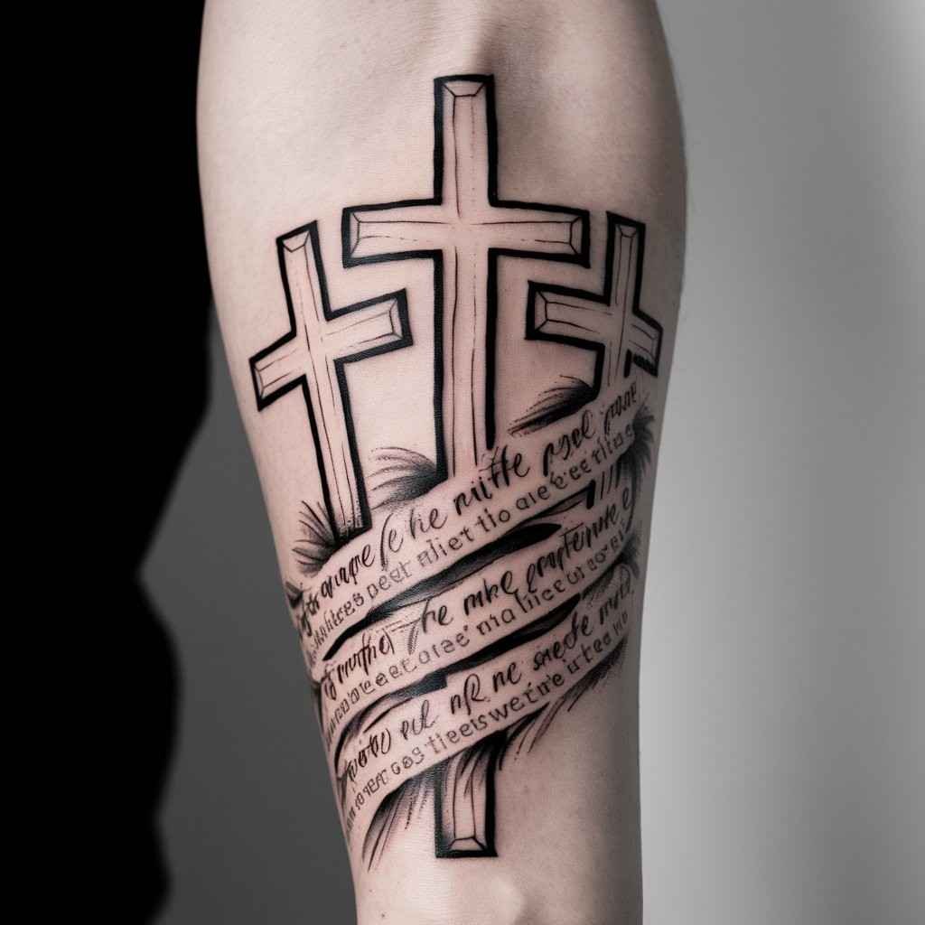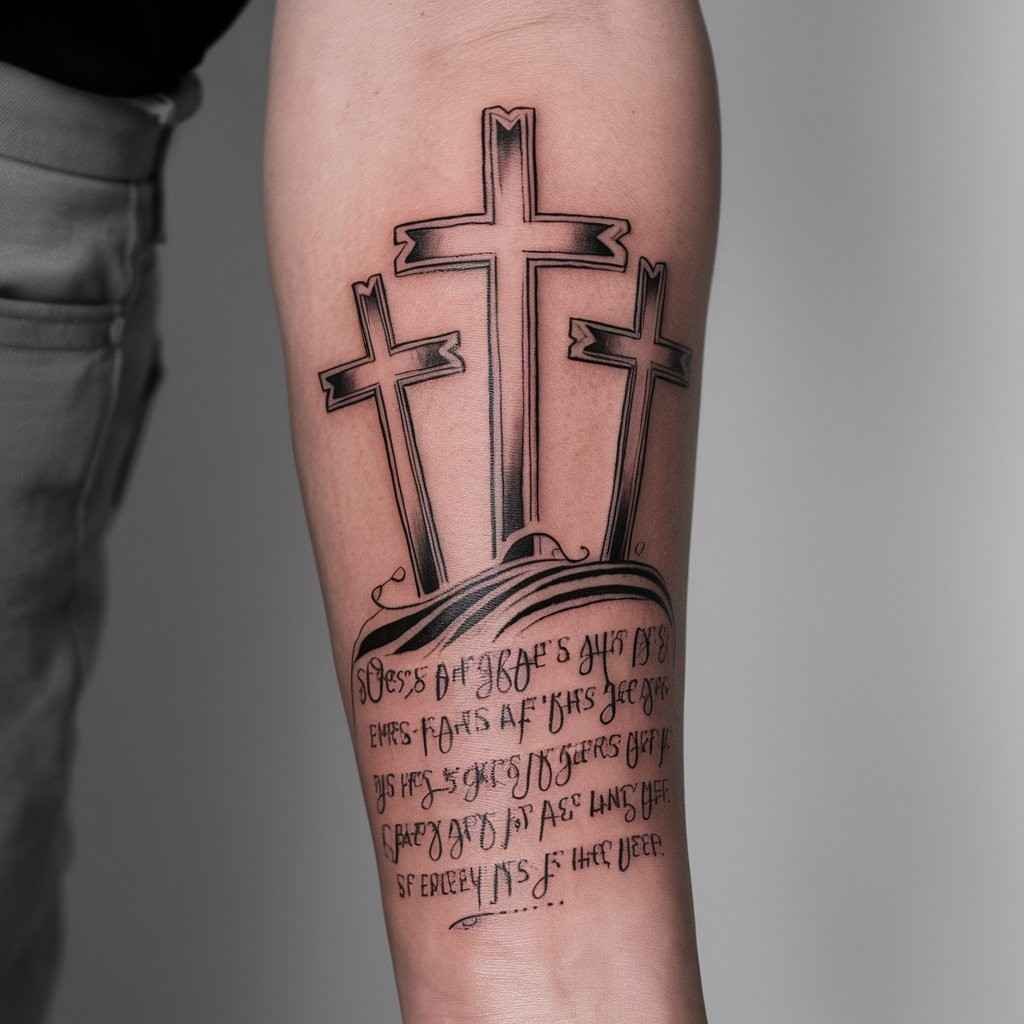 Adding a Bible verse beneath or around the crosses adds even more significance to the tattoo. Choose a verse that resonates with you or holds special meaning. This design is perfect for someone who wants to carry their faith with them and reflect on scripture daily.