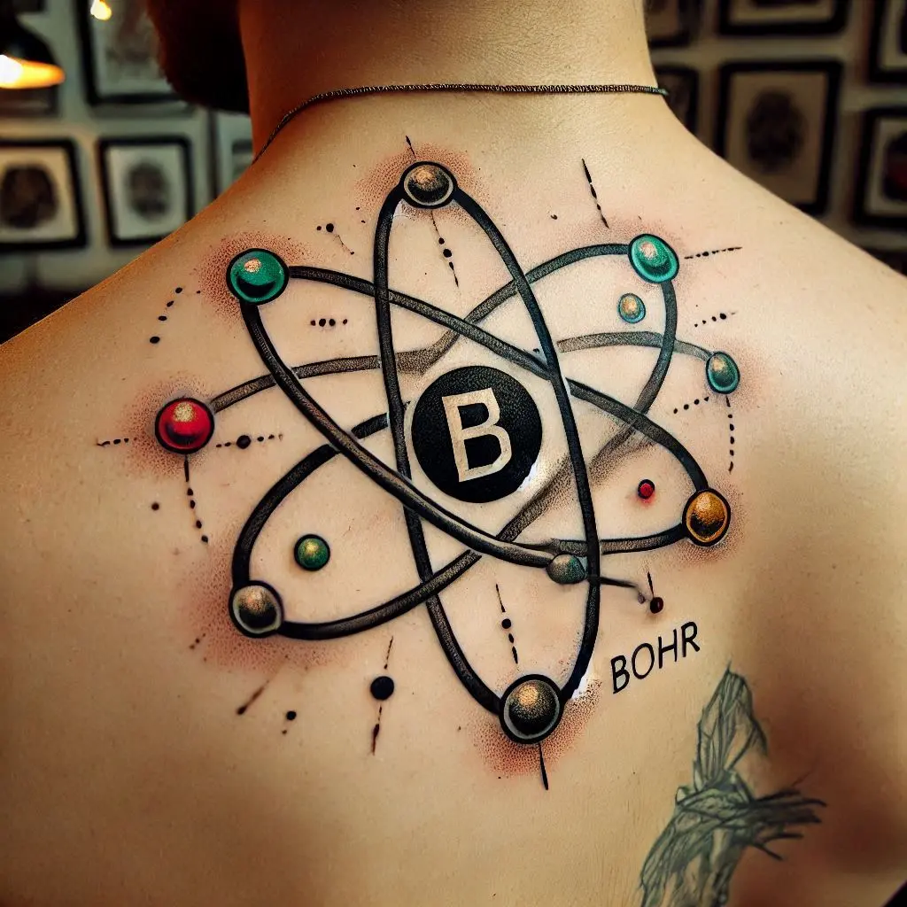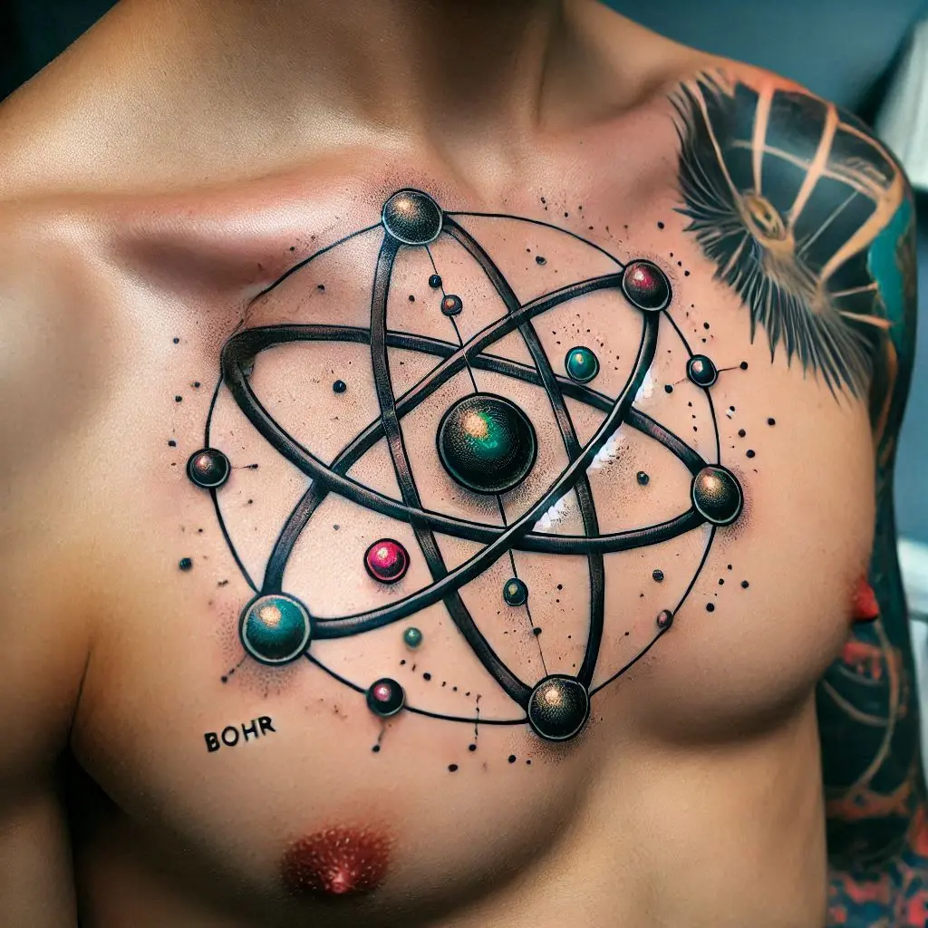 Description: A tattoo of the Bohr model with orbiting electrons is simple yet striking.
