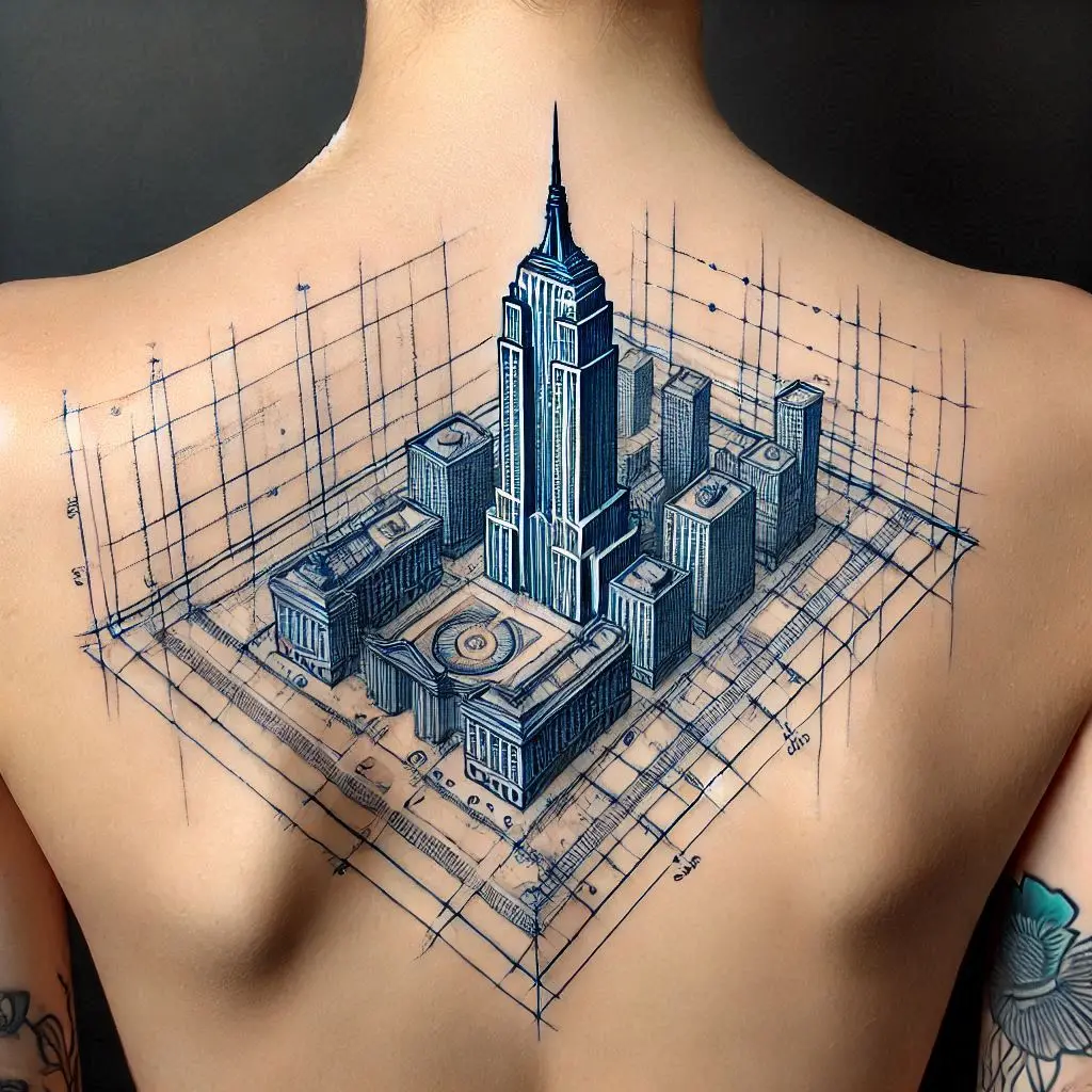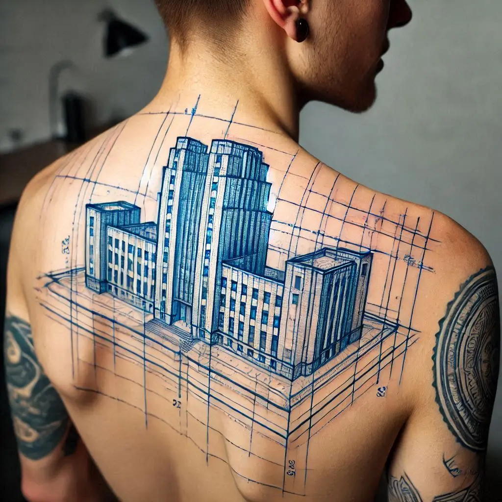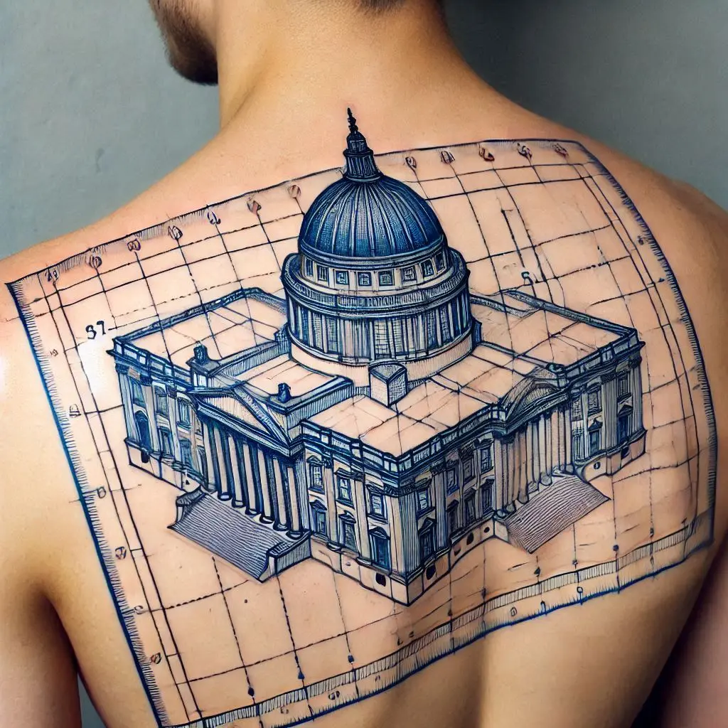Description: A tattoo of a blueprint—be it a building, machine, or invention—is a great way to showcase your love for design.