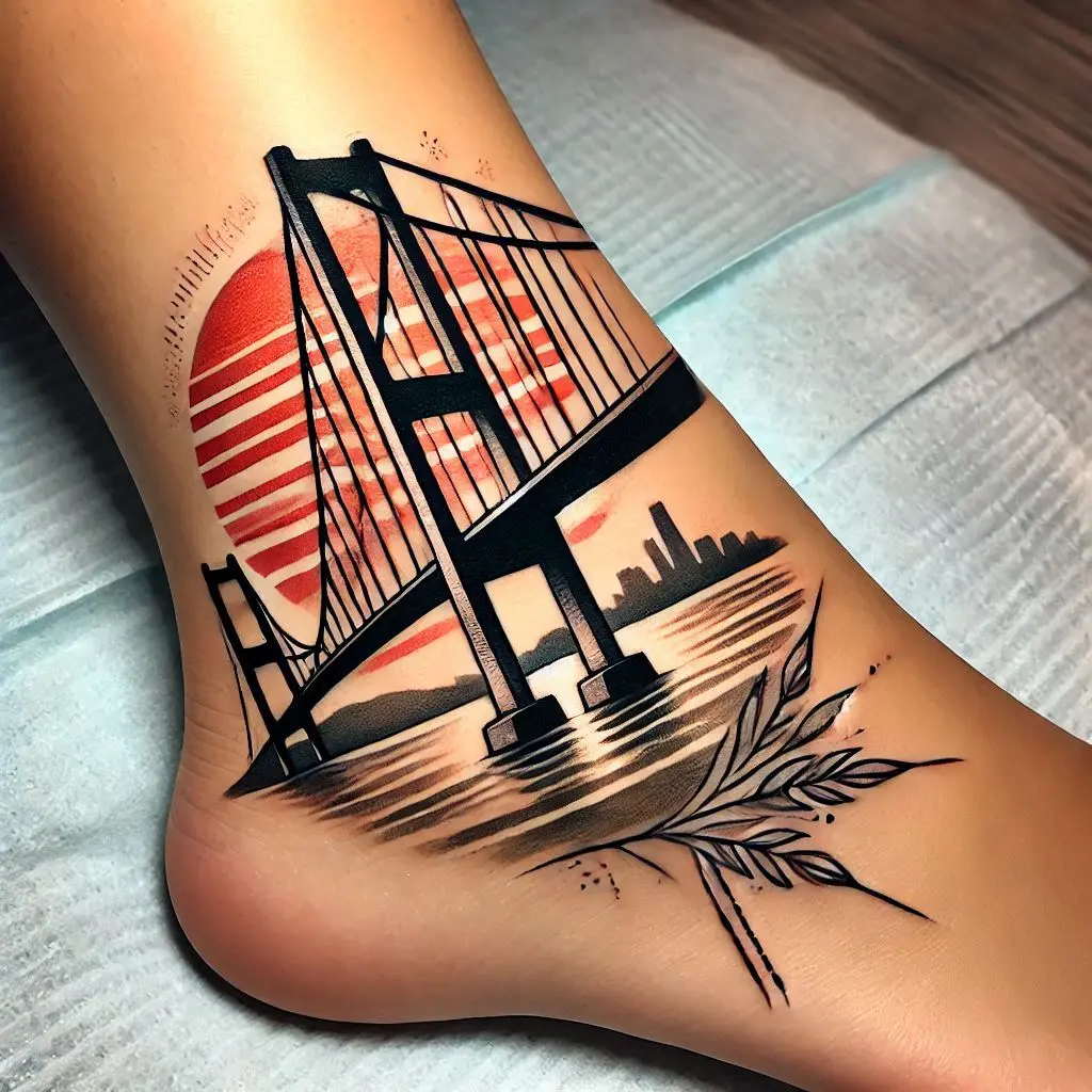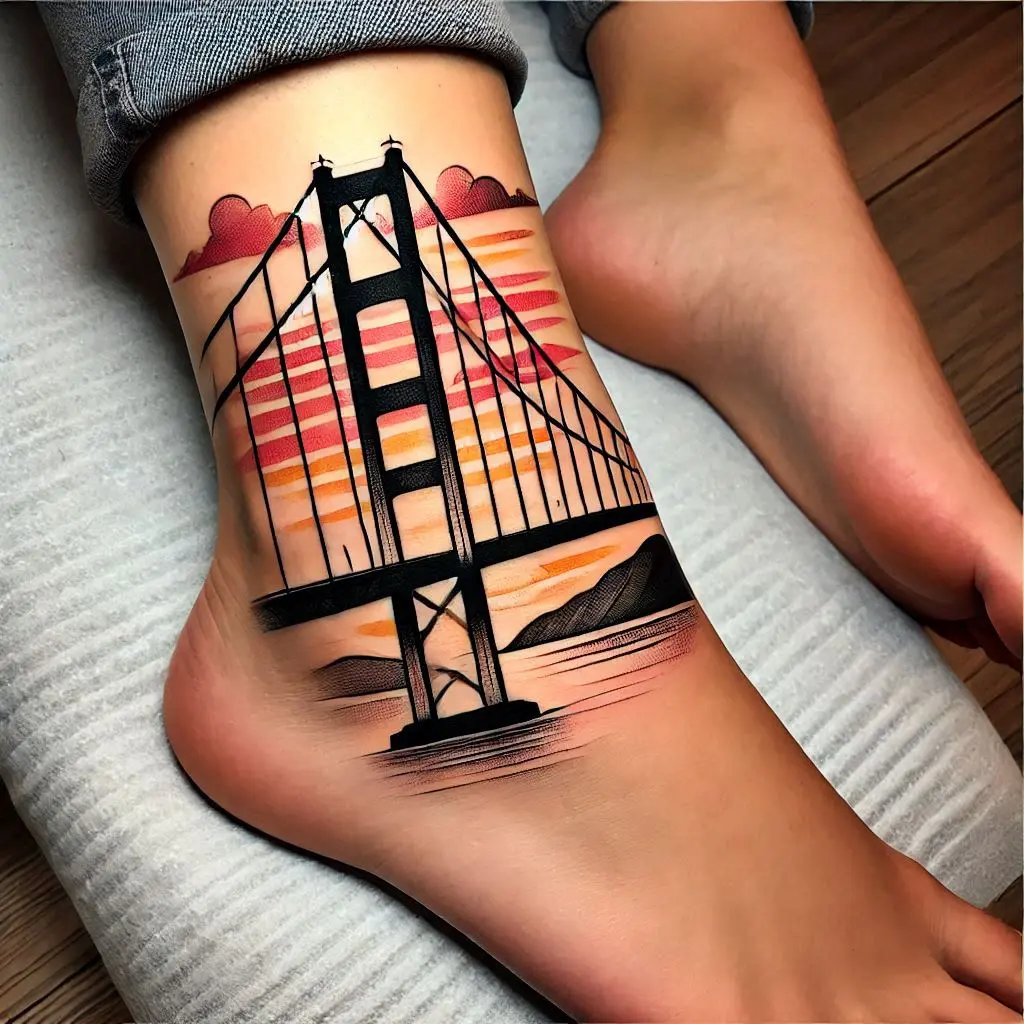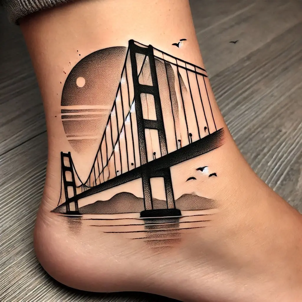 Description: A tattoo of a suspension or truss bridge symbolizes strength and connection. Add shading for depth.