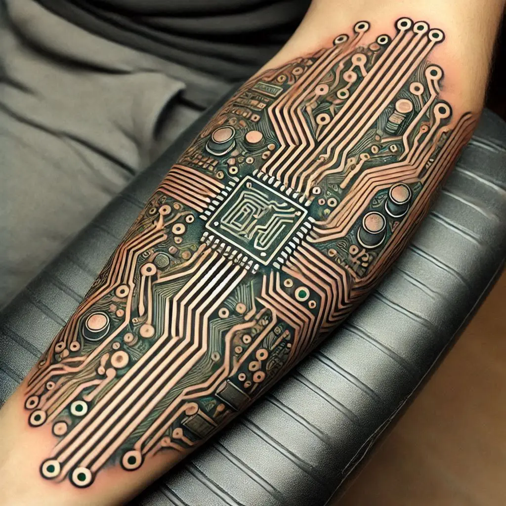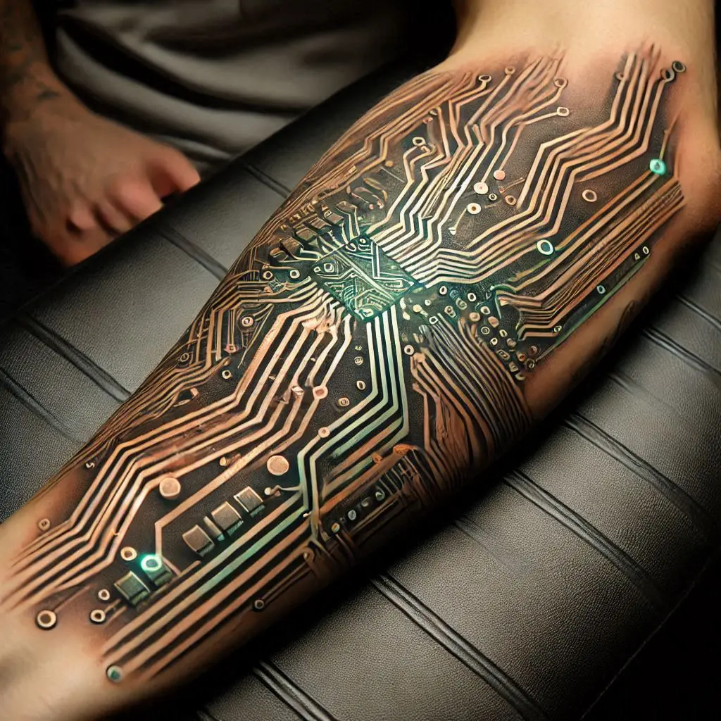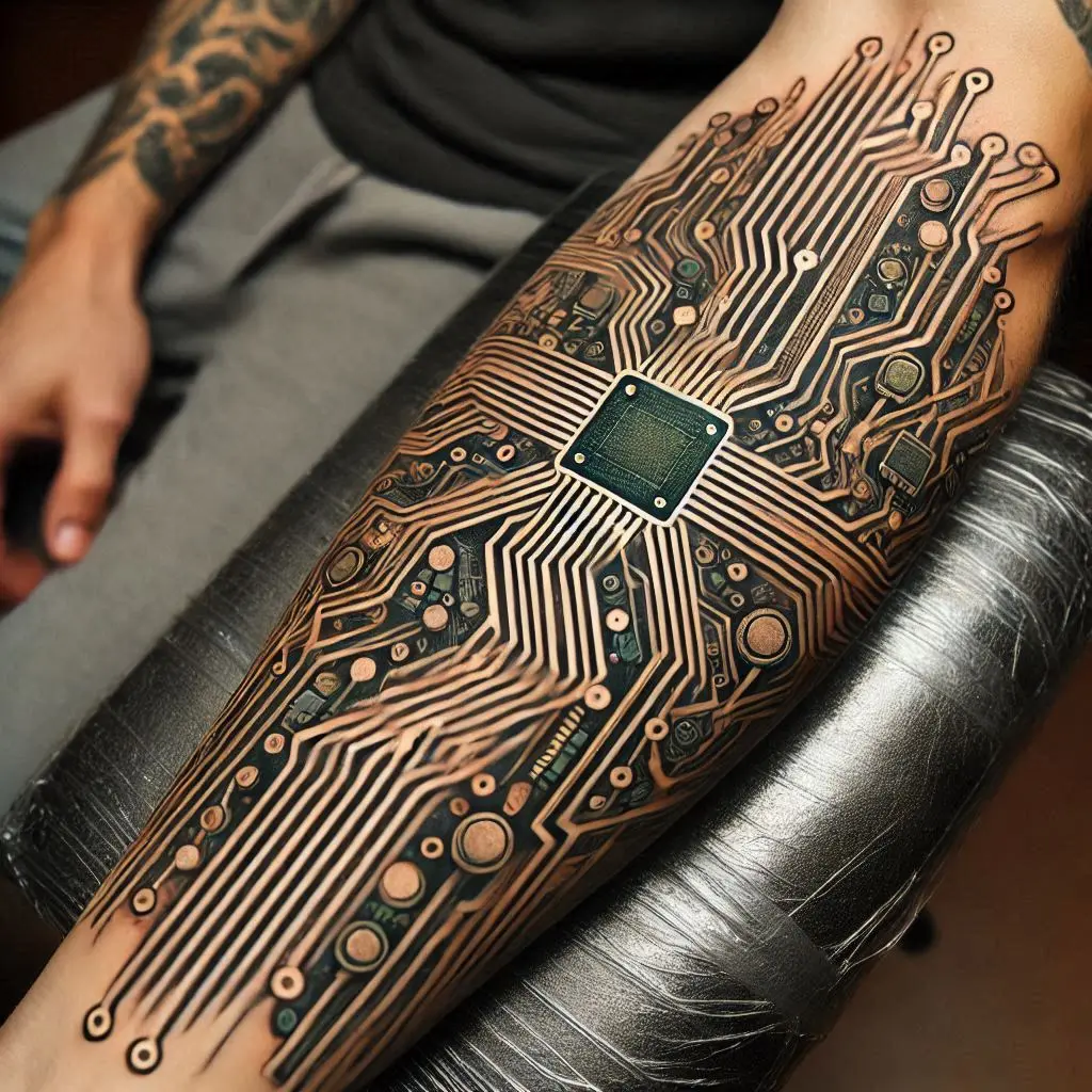 Description: A detailed tattoo of a circuit board, with its intricate lines and pathways, looks stunning. You can keep it minimalist or add colorful highlights.