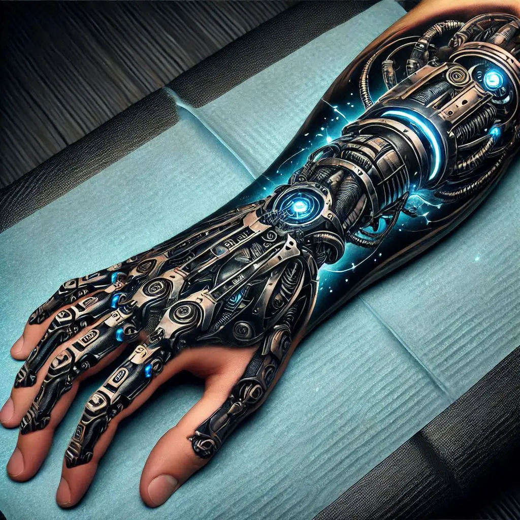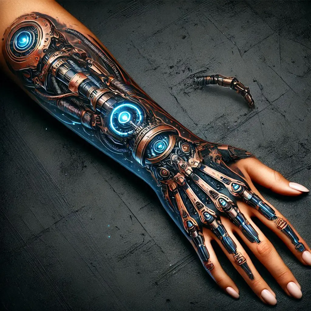 Description: A cybernetic arm or hand, merging human and mechanical elements, creates a futuristic vibe.