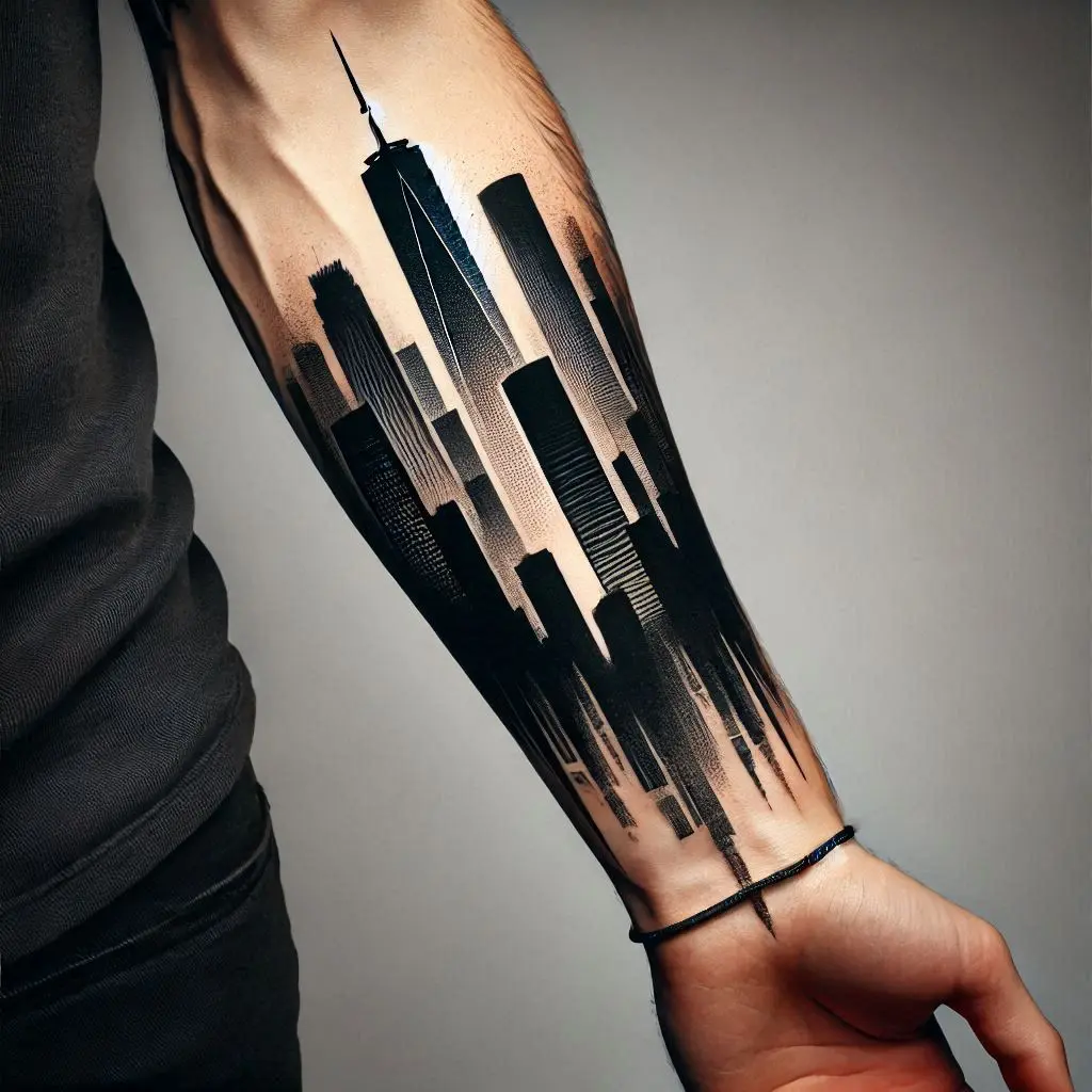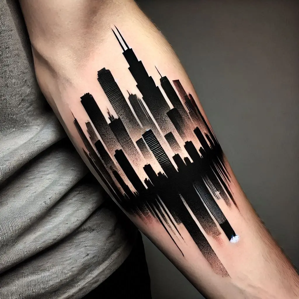 Description: A tattoo of a city skyline with emphasis on tall, iconic structures.