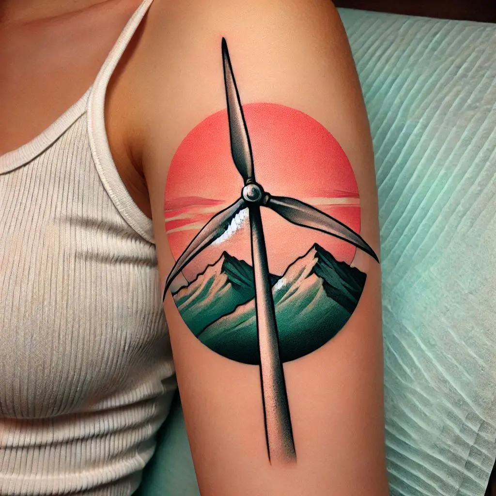 Description: A tattoo of a wind turbine with artistic elements like a sunrise or mountains.