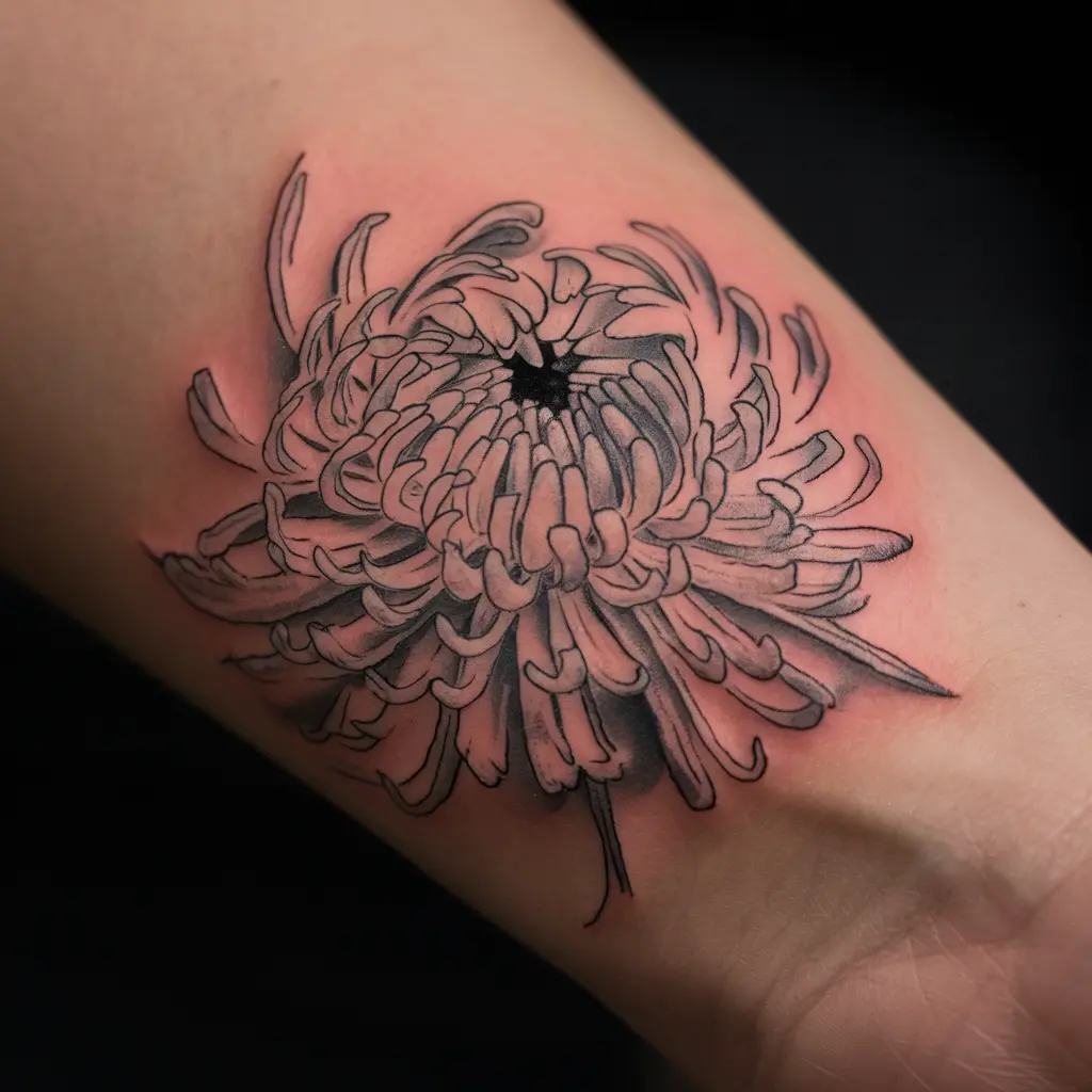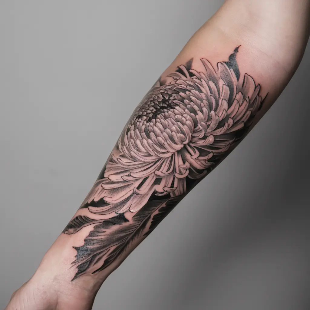 For those who appreciate the beauty of black-and-white tattoos, a detailed chrysanthemum in shades of grey is a stunning option. The intricacy of the petals and the fine lines create a beautiful contrast, giving the tattoo depth and texture.