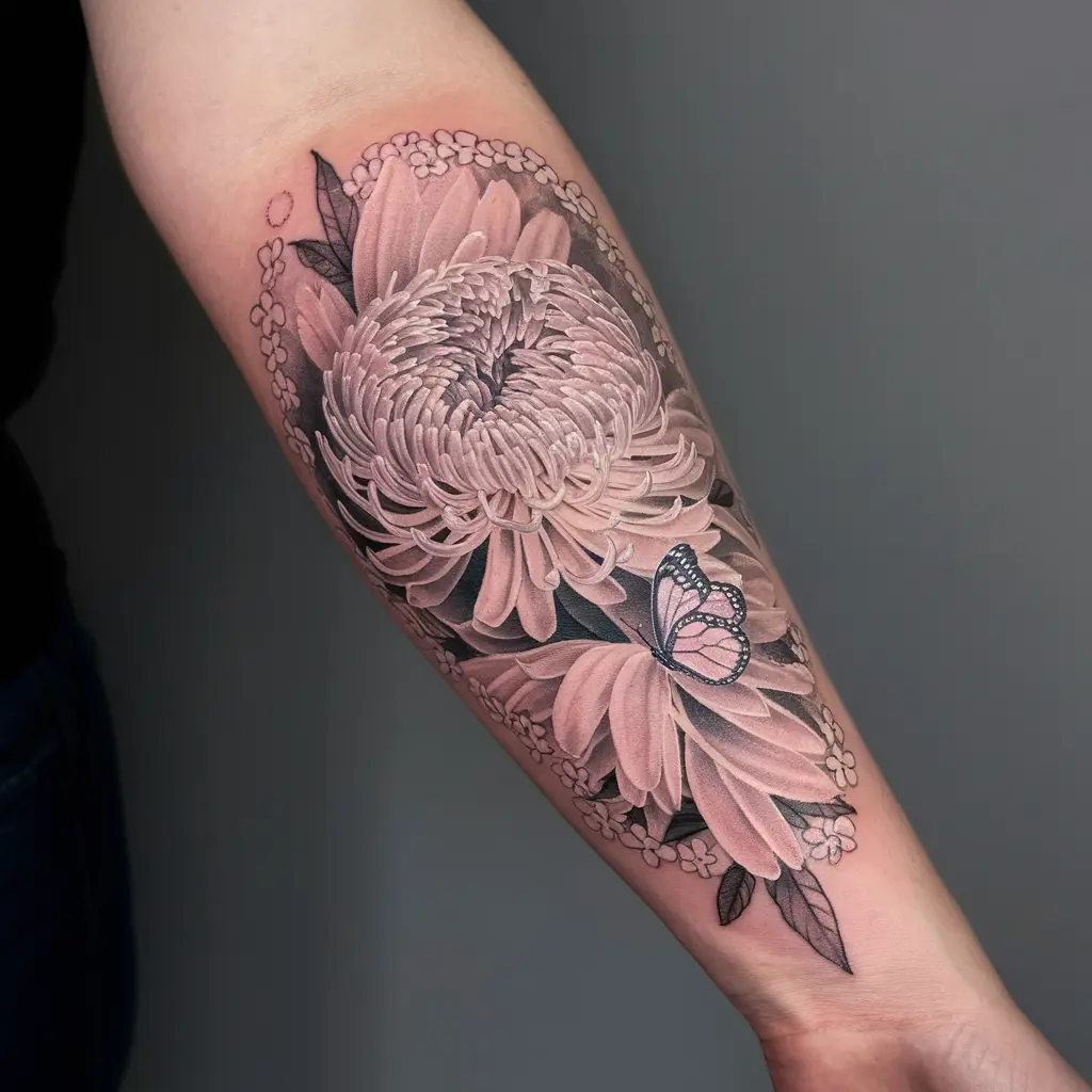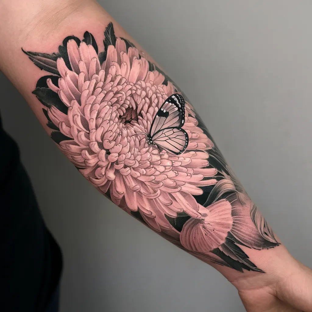 Tattoo Meaning: The chrysanthemum symbolizes joy, while the butterfly represents change and growth.