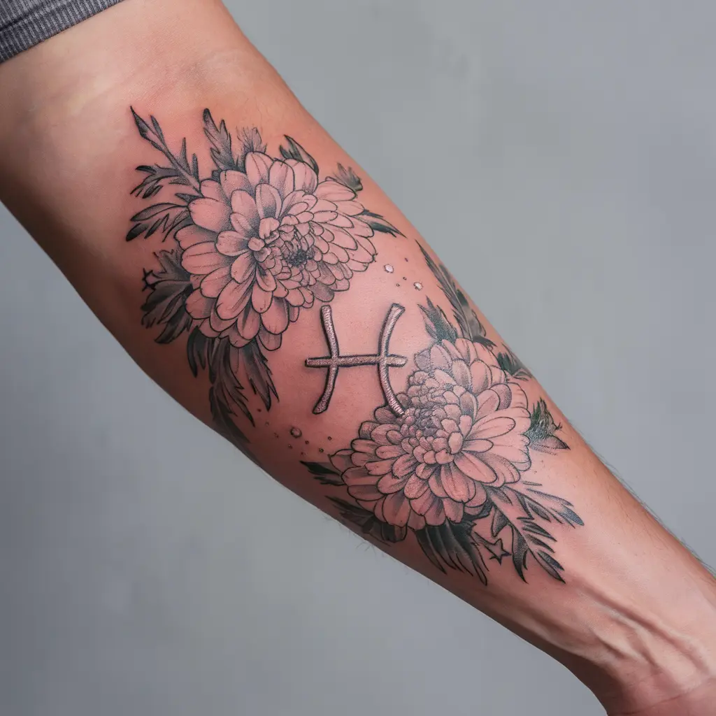 Tattoo Meaning: The chrysanthemum represents joy and positivity, while your zodiac sign adds a deeper, personalized layer of meaning.