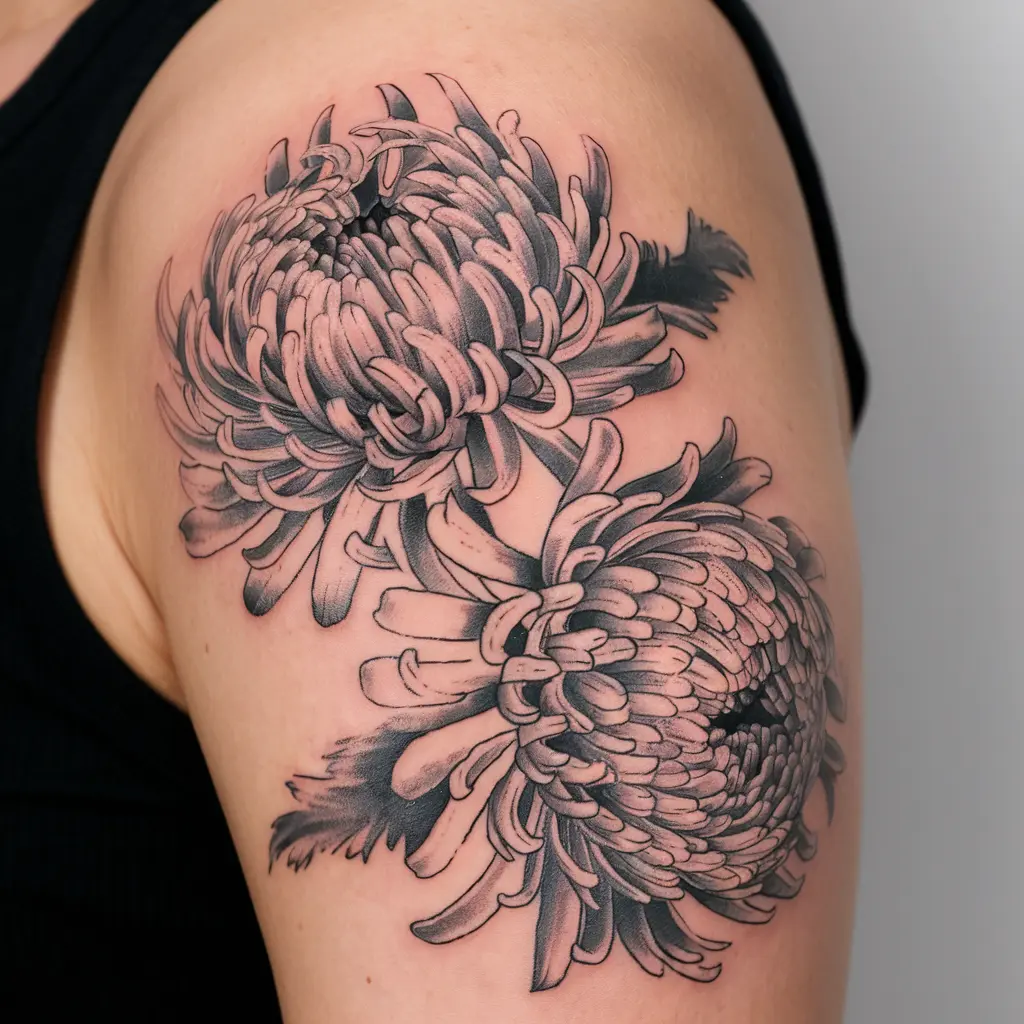 Tattoo Meaning: Dual chrysanthemums symbolize unity, partnership, and balance.