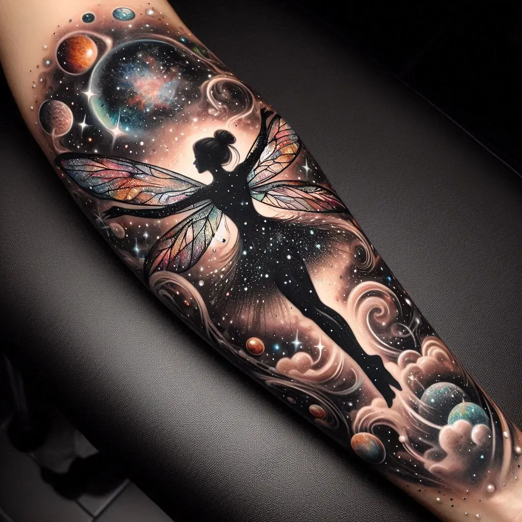 Tattoo Meaning: The celestial fairy represents freedom, limitless potential, and the belief that anything is possible in the vast universe. It encourages exploration of both the outer world and inner self.