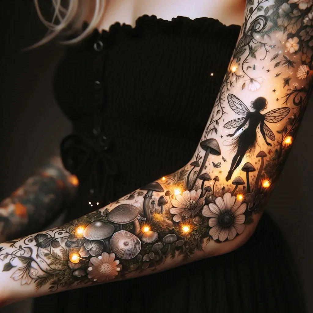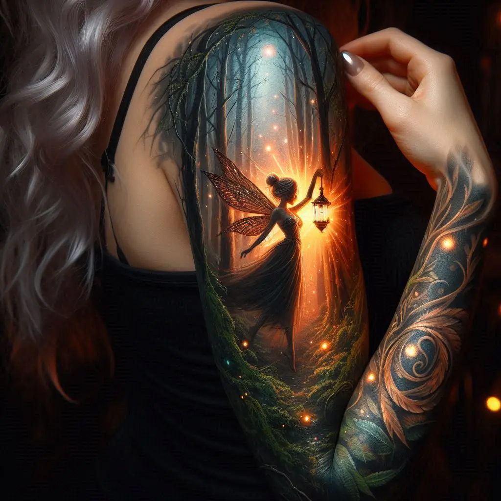 The enchanted forest is a timeless setting for fairy tattoos. Imagine a delicate fairy fluttering among towering trees, surrounded by mushrooms, flowers, and glowing fireflies. The forest symbolizes mystery, magic, and connection to nature. This tattoo brings the enchanted world of fairies to life in an intricate sleeve design.