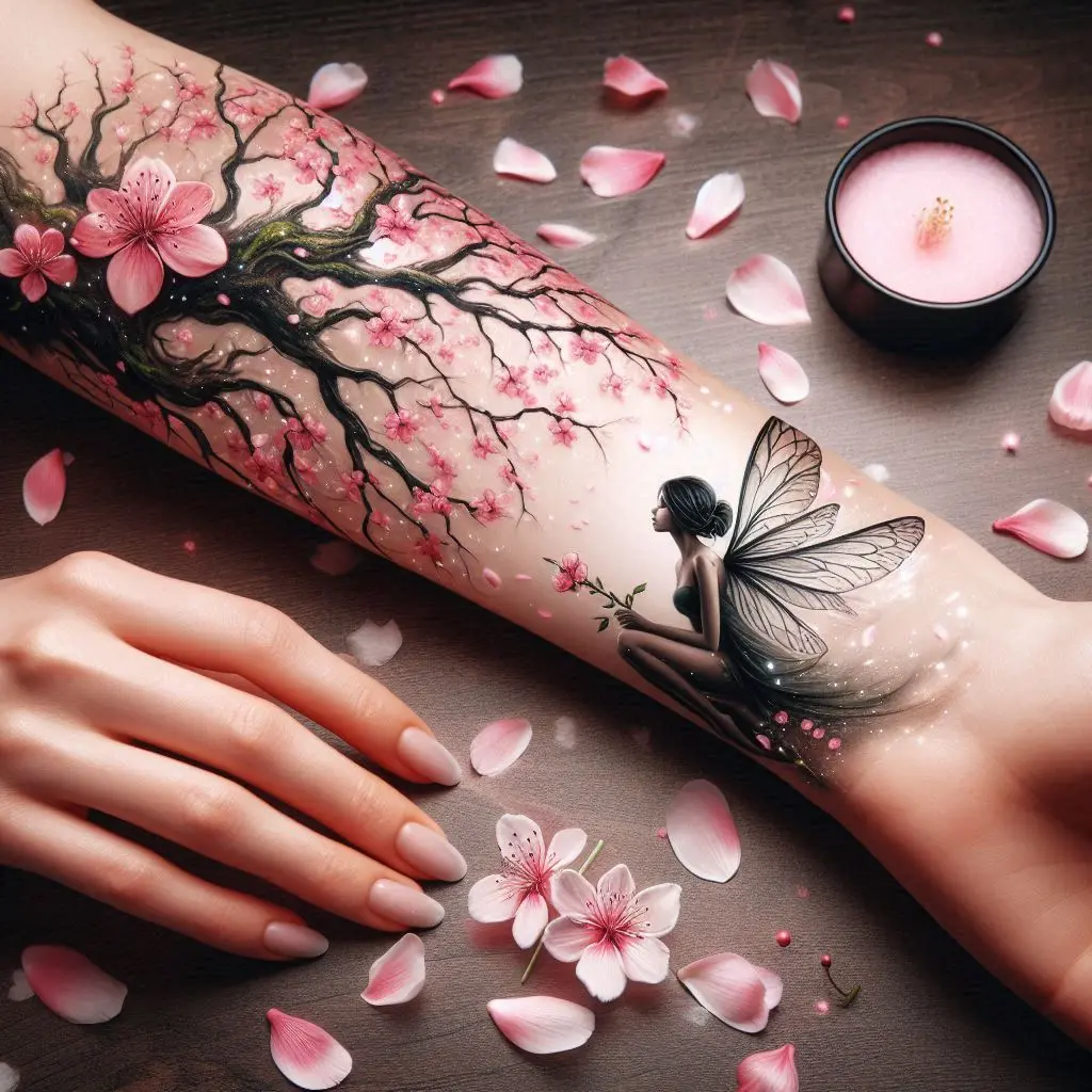 A cherry blossom tree is a symbol of beauty, fragility, and the fleeting nature of life. A fairy sitting beneath its branches represents peace, serenity, and an appreciation for the present moment. This tattoo reminds us to cherish the beauty in every passing season.