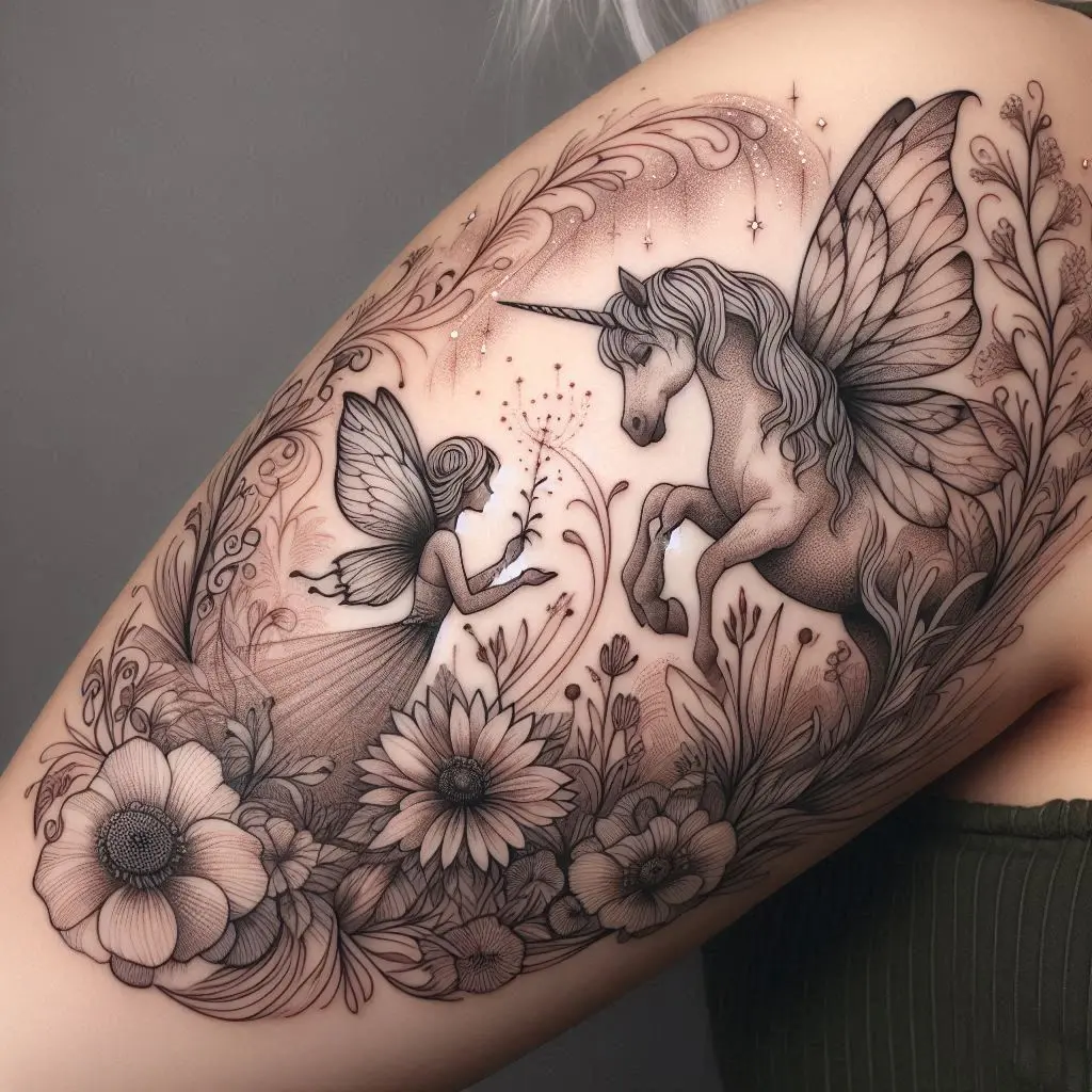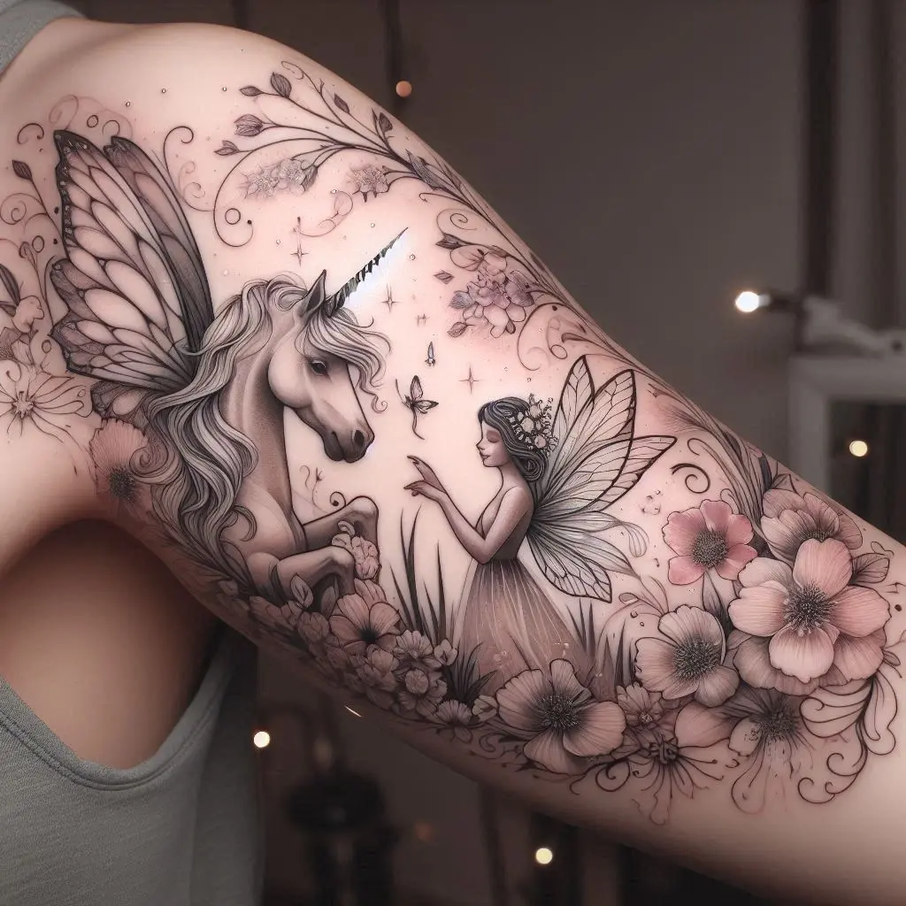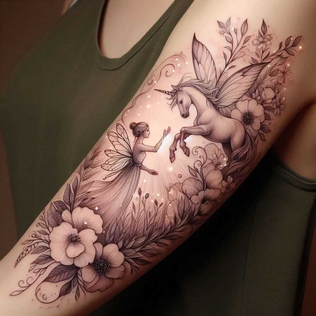 Fairies and unicorns both carry strong associations with magic and fantasy. A tattoo of a fairy riding or interacting with a unicorn adds a playful, magical touch to the sleeve. It’s a combination of two iconic symbols of imagination.