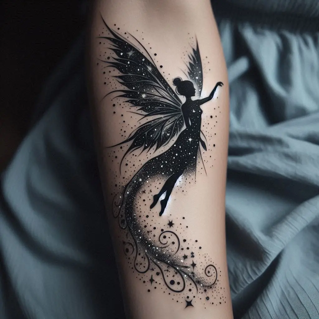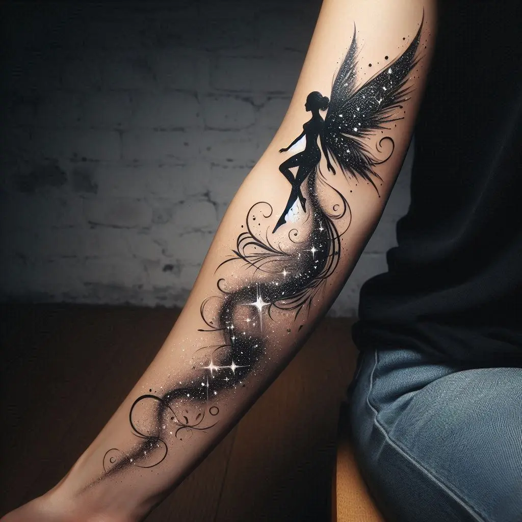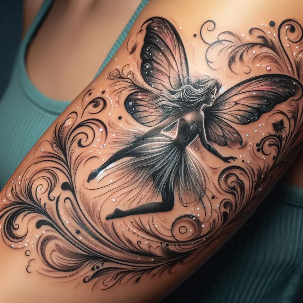 A fairy mid-flight, wings spread wide, gliding across your skin, is an image of freedom and grace. The wind beneath her wings symbolizes movement, energy, and the desire to soar to new heights.