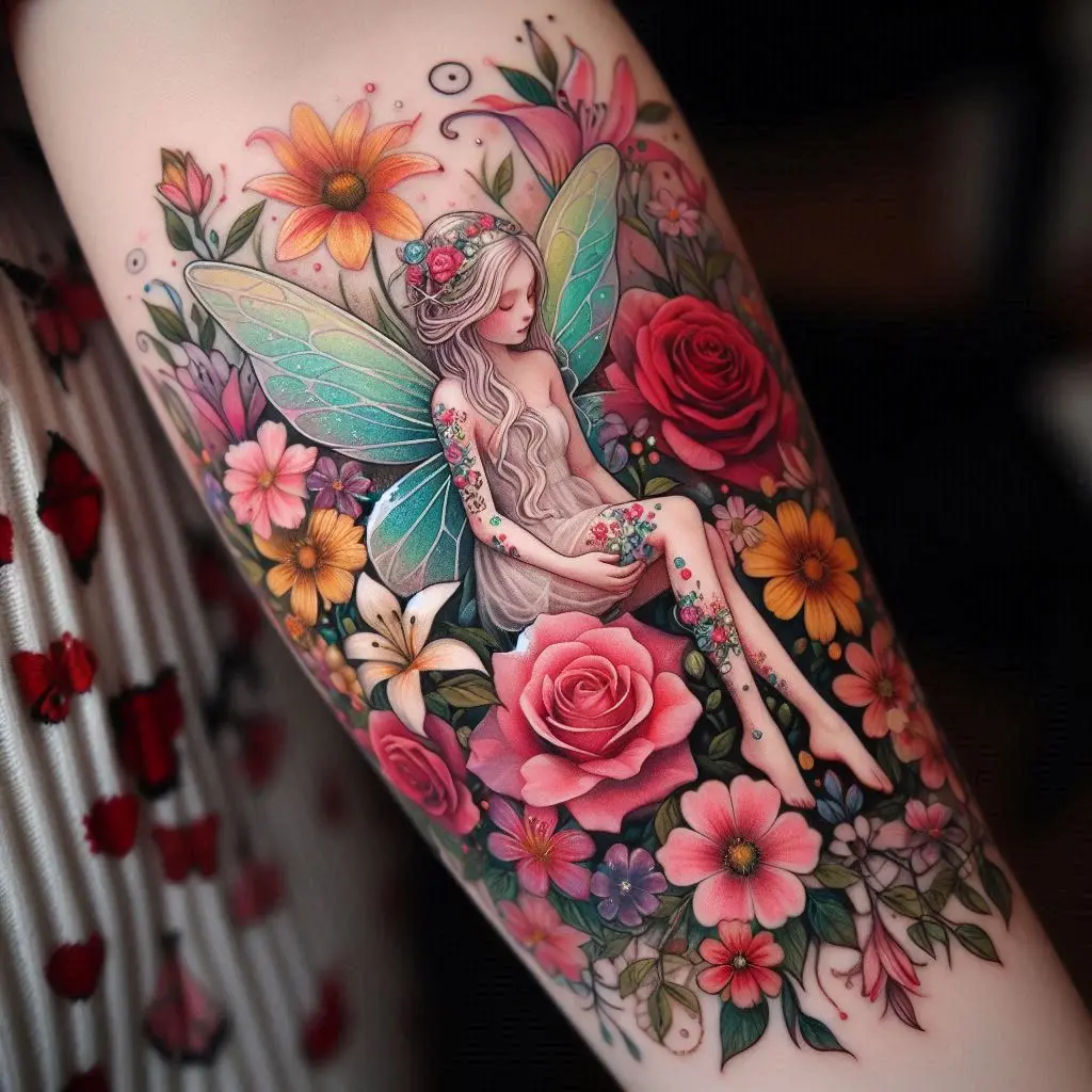 Fairies and flowers go hand in hand. A flower fairy tattoo can show a fairy sitting among colorful blooms, with each flower representing different meanings. Roses symbolize love, lilies represent purity, and daisies are often associated with innocence and new beginnings. This sleeve tattoo combines nature’s beauty with the playful spirit of fairies.