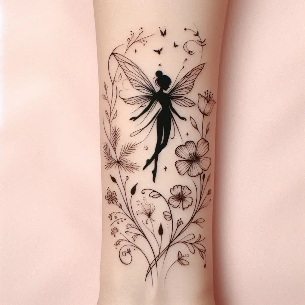 A minimalistic flower fairy tattoo with soft lines and floral accents can create a beautiful silhouette. This design focuses on the delicate nature of the fairy, with subtle floral details to enhance the softness of the design.
